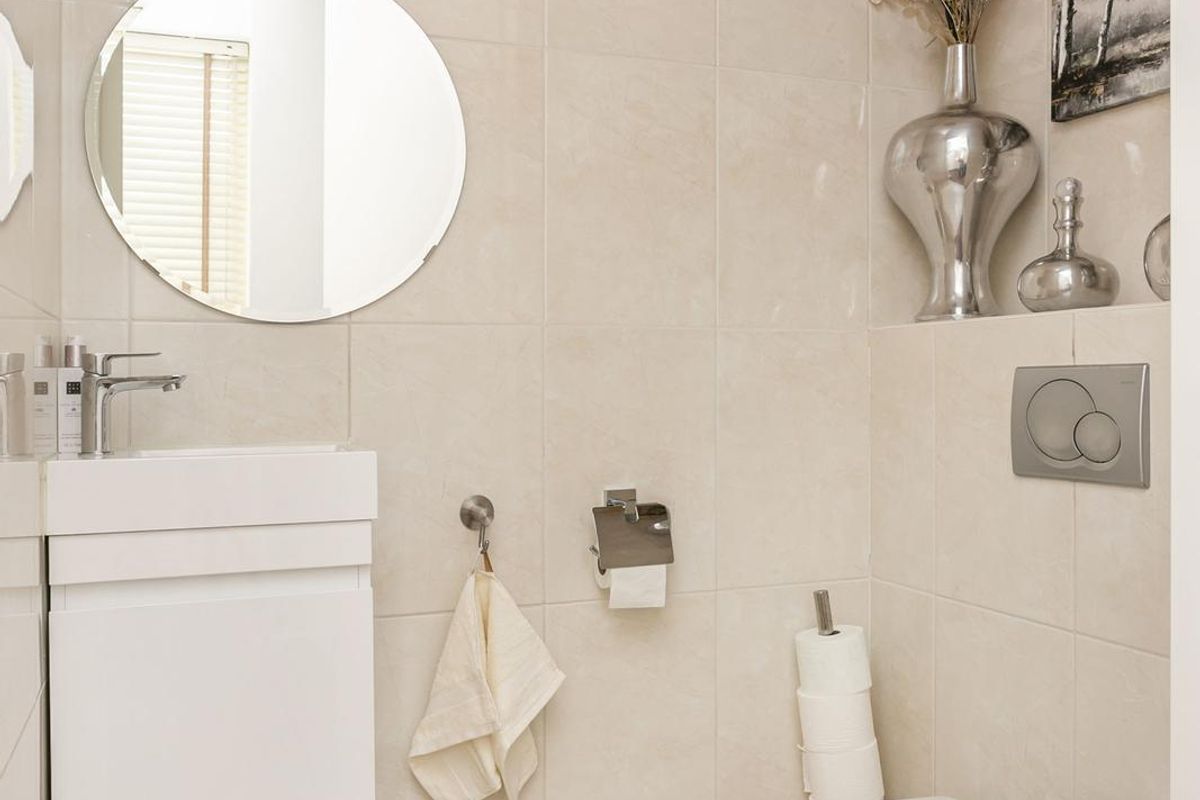 Entree, hal met meterkast en modern toilet (wandcloset met fonteintje). Aan de voorzijde bevindt zich de luxe open keuken met composieten werkblad en hoogwaardige inbouwapparatuur, waaronder een 5-pits inductiekookplaat, combi-oven (o.a. Bosch) en vaatwasser.