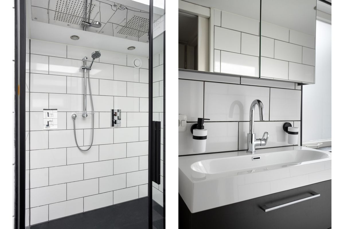 De grote moderne badkamer is voorzien van elektrische vloerverwarming en van het volgende sanitair:
