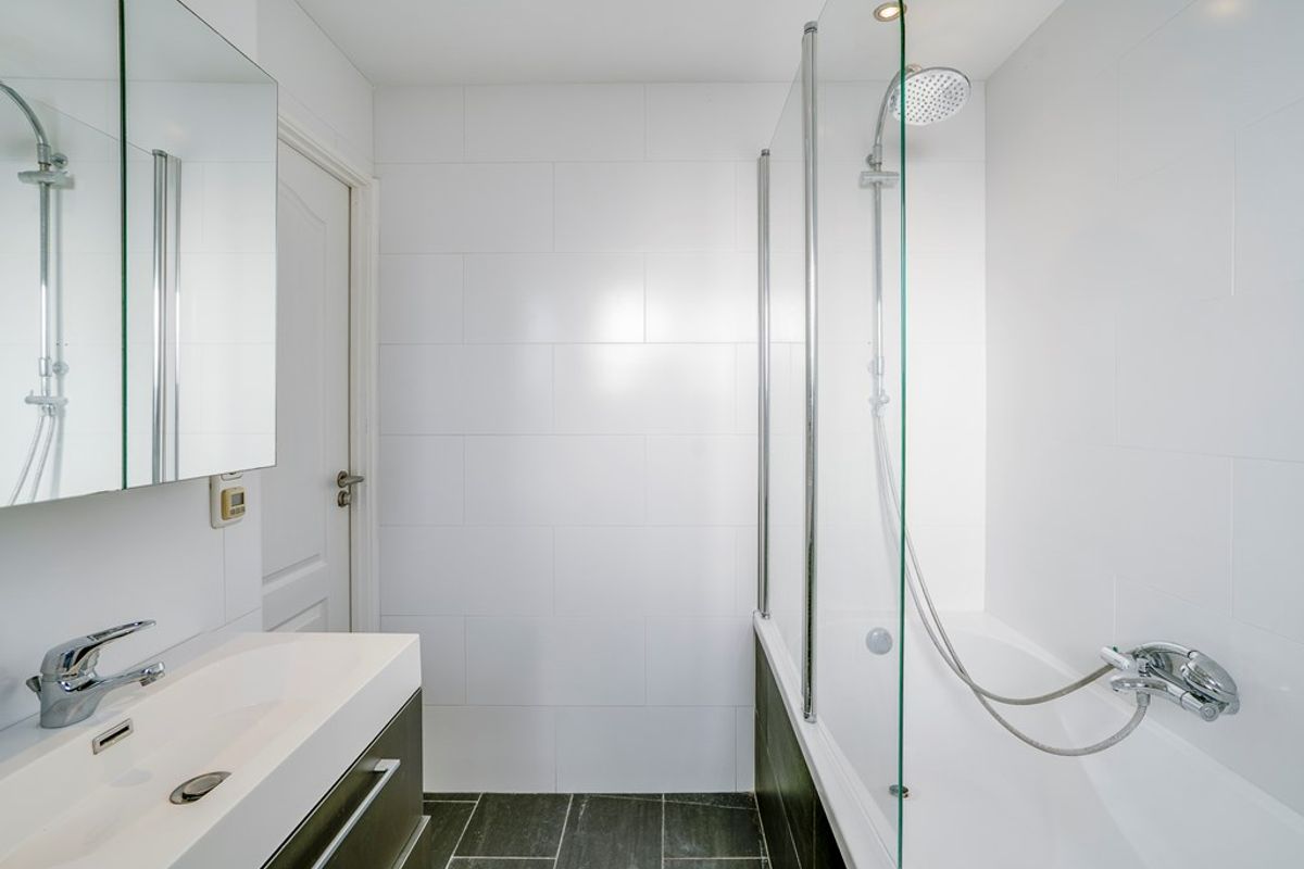 De badkamer is compleet ingericht met een ligbad met douchevoorziening, een zwevend toilet, een dubbel wastafelmeubel én vloerverwarming.