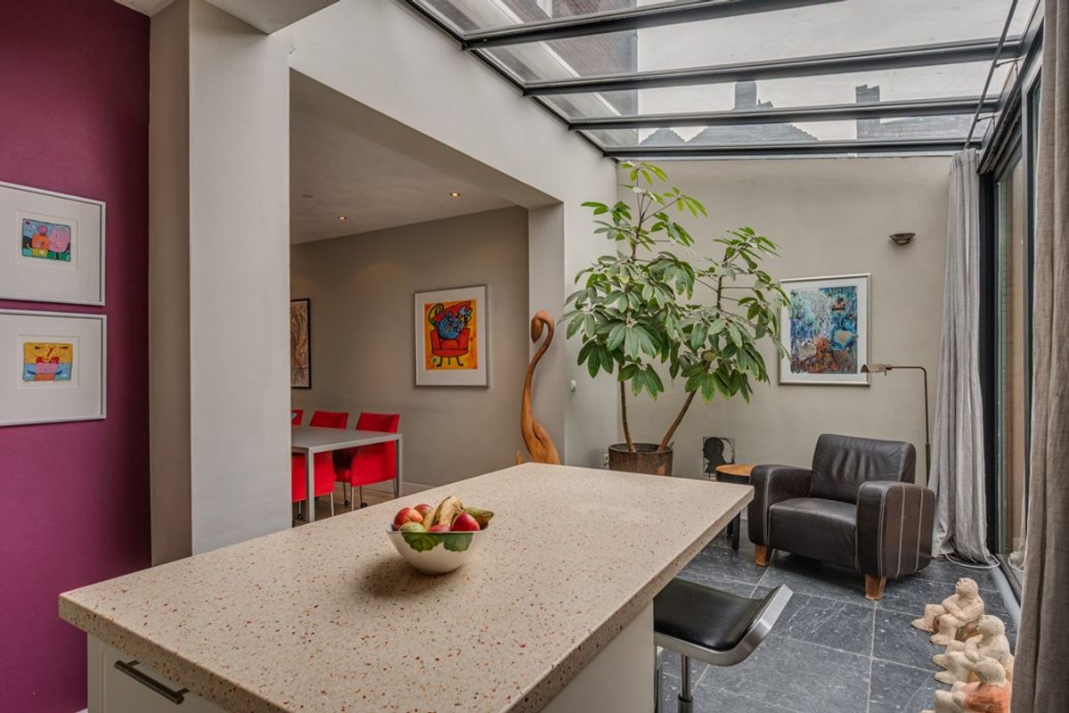 De begane grond is heerlijk licht dankzij de serre. Via de grote glazen schuifdeur loopt de woonkamer naadloos over in de tuin, waardoor binnen en buiten één geheel vormen . De glazen overkapping met zonwering maken het mogelijk om in elk seizoen van het buitenleven te genieten.