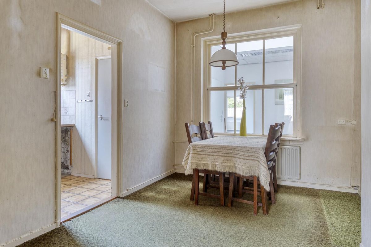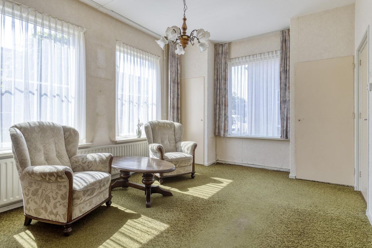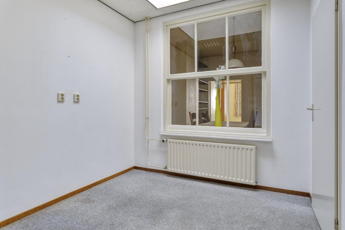 Daarna treft u een tussenportaal met toilet en de achterdeur welke toegang geeft tot de tuin. De aanbouw is ingedeeld in 2 ruimtes, voorheen is dit kantoor en spreekruimte geweest. Via een vlizotrap is er een riante bergzolder te bereiken.