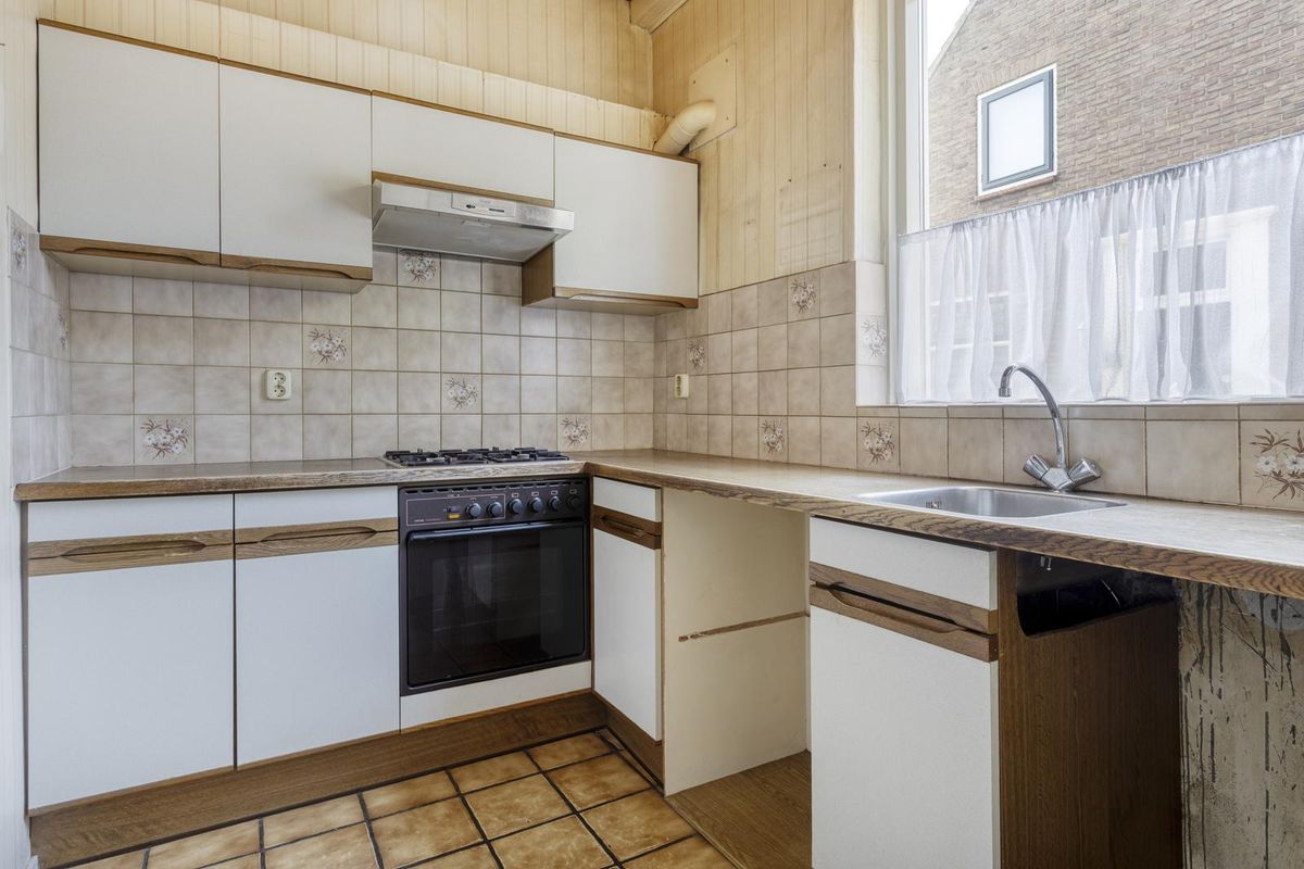 Begane grond, hal met meterkast en trapopgang. De woonkamer is verdeeld in zit- en eetkamer. Het zitgedeelte is aan de voorzijde van de woning gesitueerd. De eetkamer geeft toegang tot de gesloten keuken, tevens is er een verdiepte trapkast. De keukenopstelling is eenvoudig van uitvoering.
