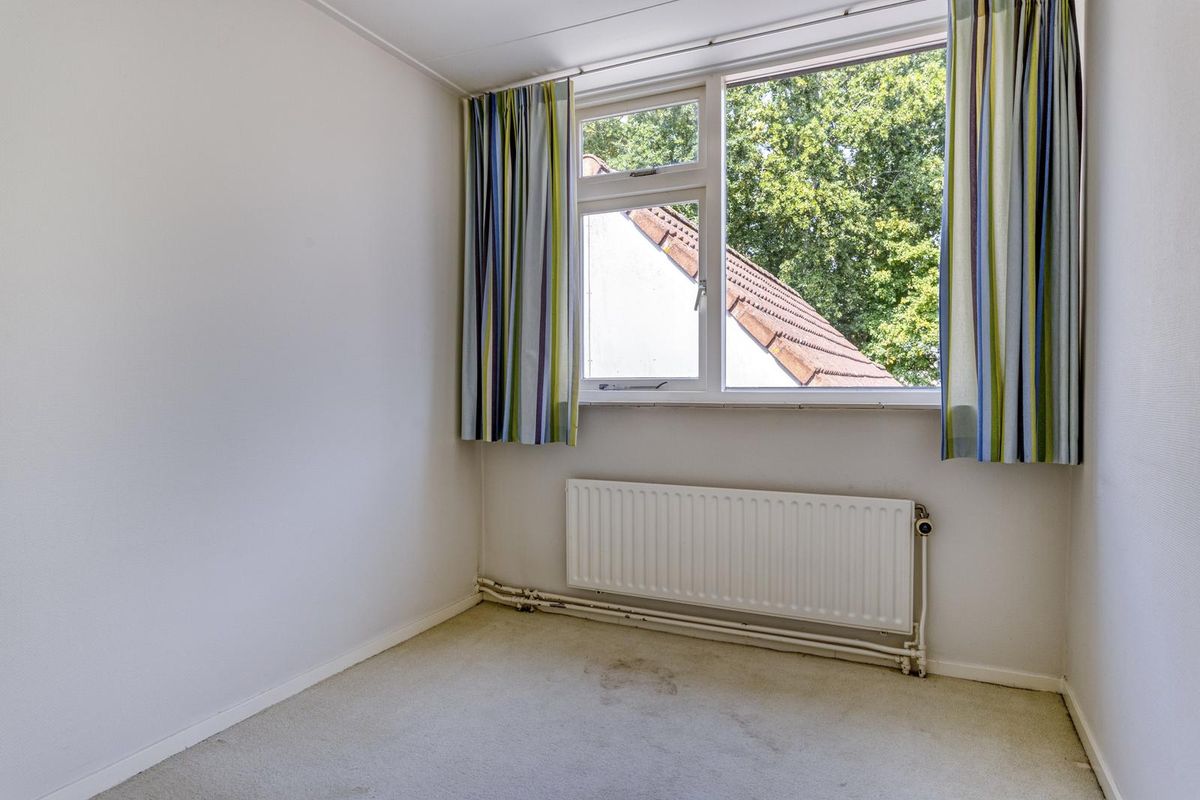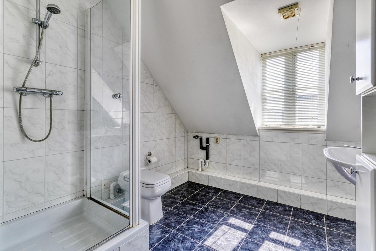 Eerste verdieping, overloop en drie slaapkamers. De badkamer is voorzien van een douchecabine, wastafelmeubel, saniboyeur en witgoedaansluiting.