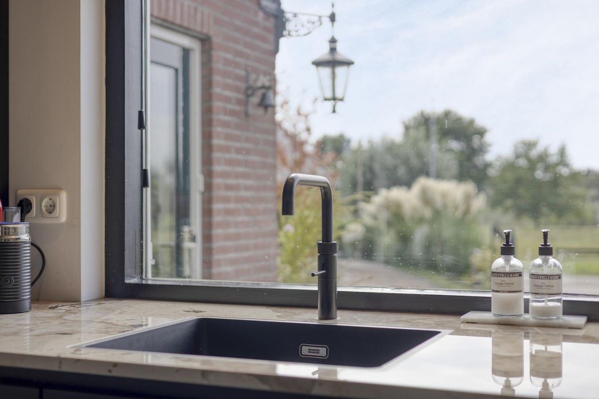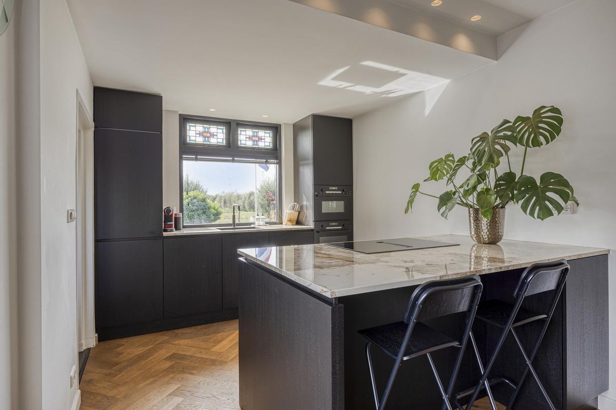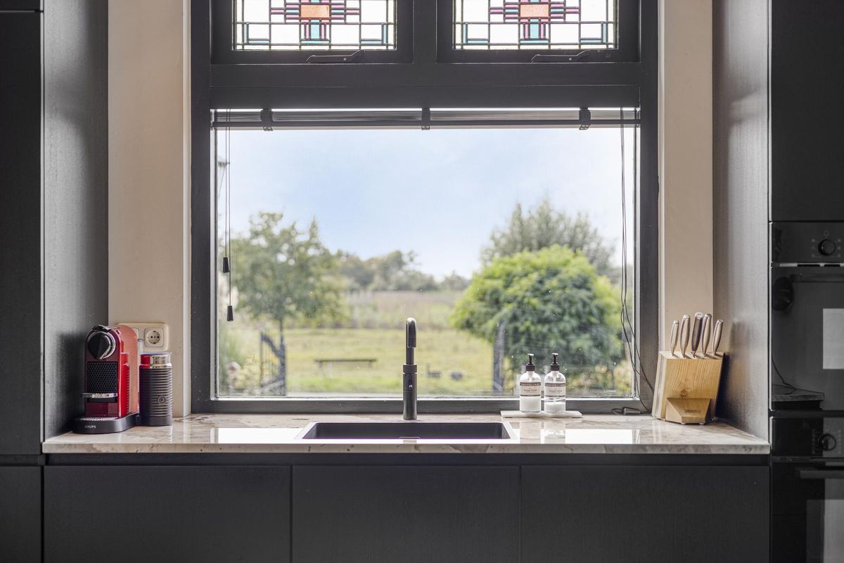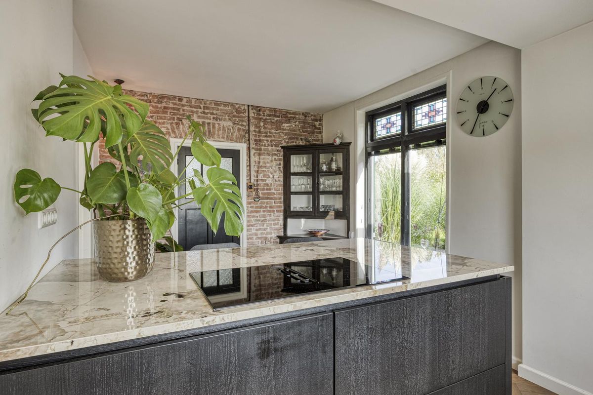 Via de bijkeuken stap je de luxueuze keuken in. Deze biedt niet alleen een prachtig blik op de tuin en de landerijen, het is ook een droom voor elke thuiskok. De keuken is opgedeeld in 2 delen, een spoelgedeelte en een schiereiland met kookgedeelte; een praktische indeling die zorgt voor maximale efficiëntie. Het schiereiland heeft tevens een keukenbar met zitgelegenheid voor meerdere personen. Uiteraard is de keuken van alle benodigde inbouwapparatuur voorzien, te weten een grote koelkast met vrieskast, Quooker (3 liter boiler), vaatwasser, heteluchtoven, combimagnetron en een inductiekookplaat met geïntegreerde brede afzuiging met plasmafilter. De keuken is afgewerkt met een Dekton aanrechtblad. Het zichtbare metselwerk en de geïntegreerde kast herinneren aan de oorspronkelijke bouw en voegt veel sfeer en charme toe aan het interieur.