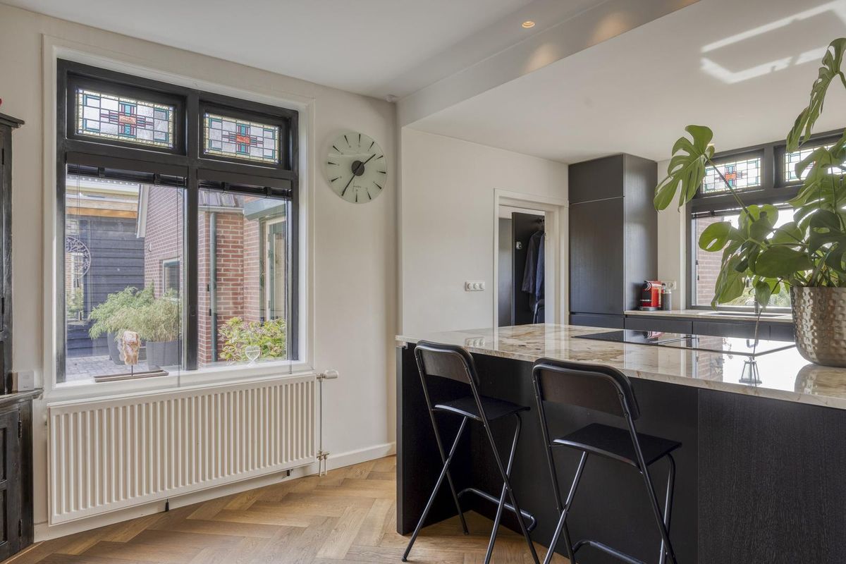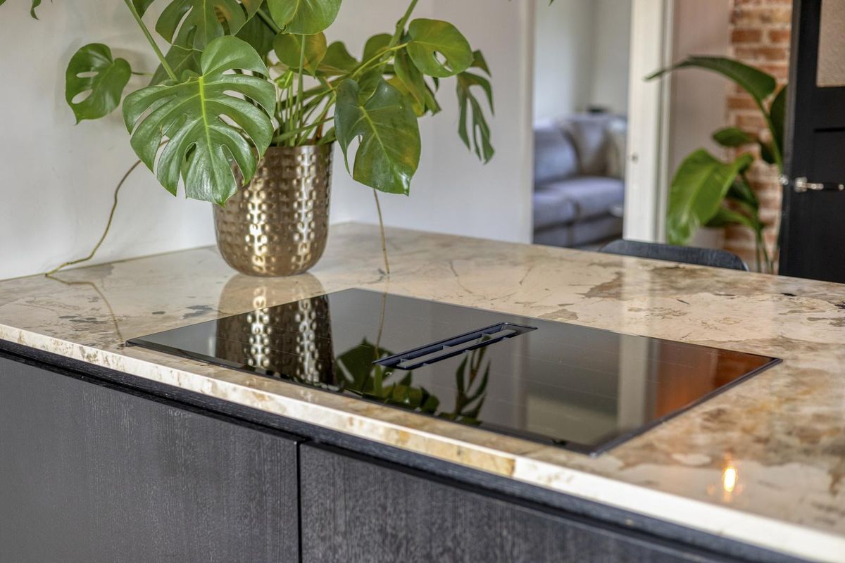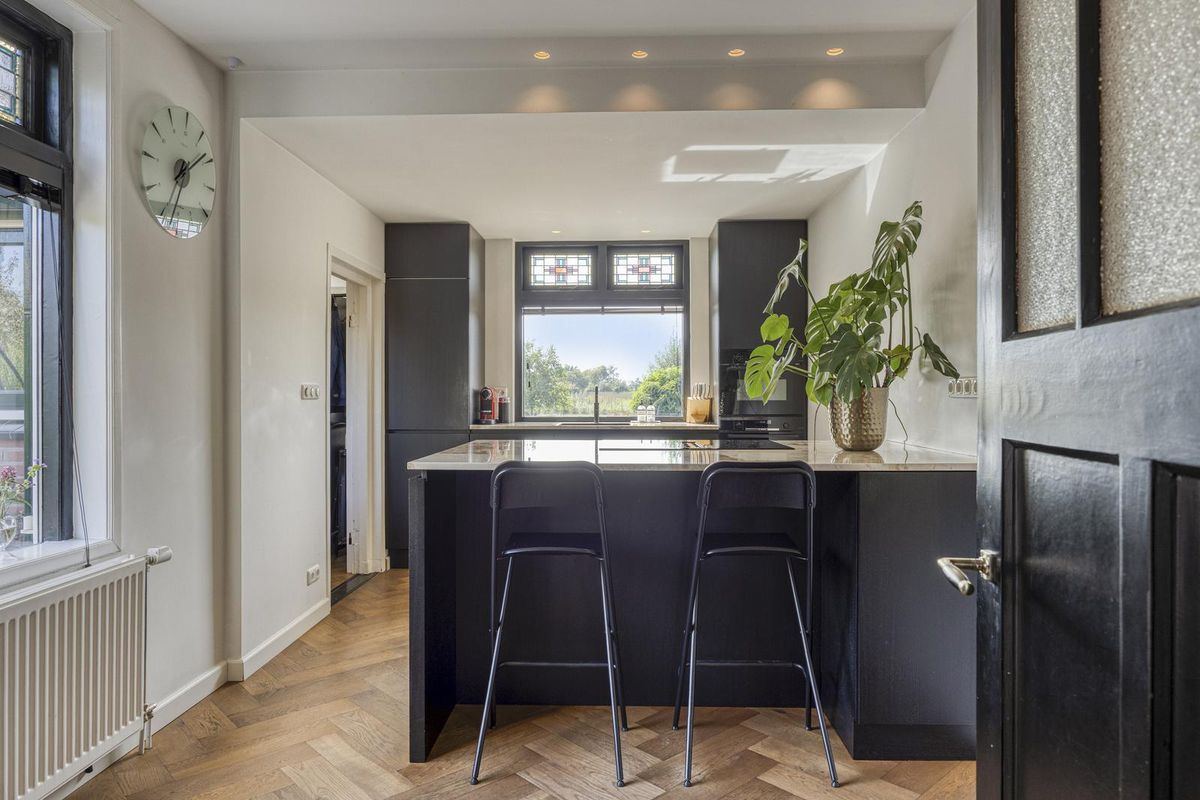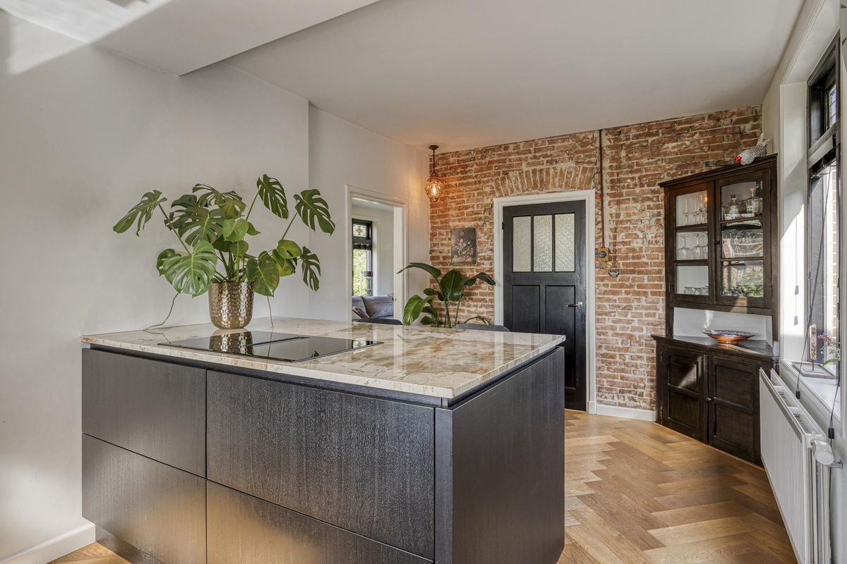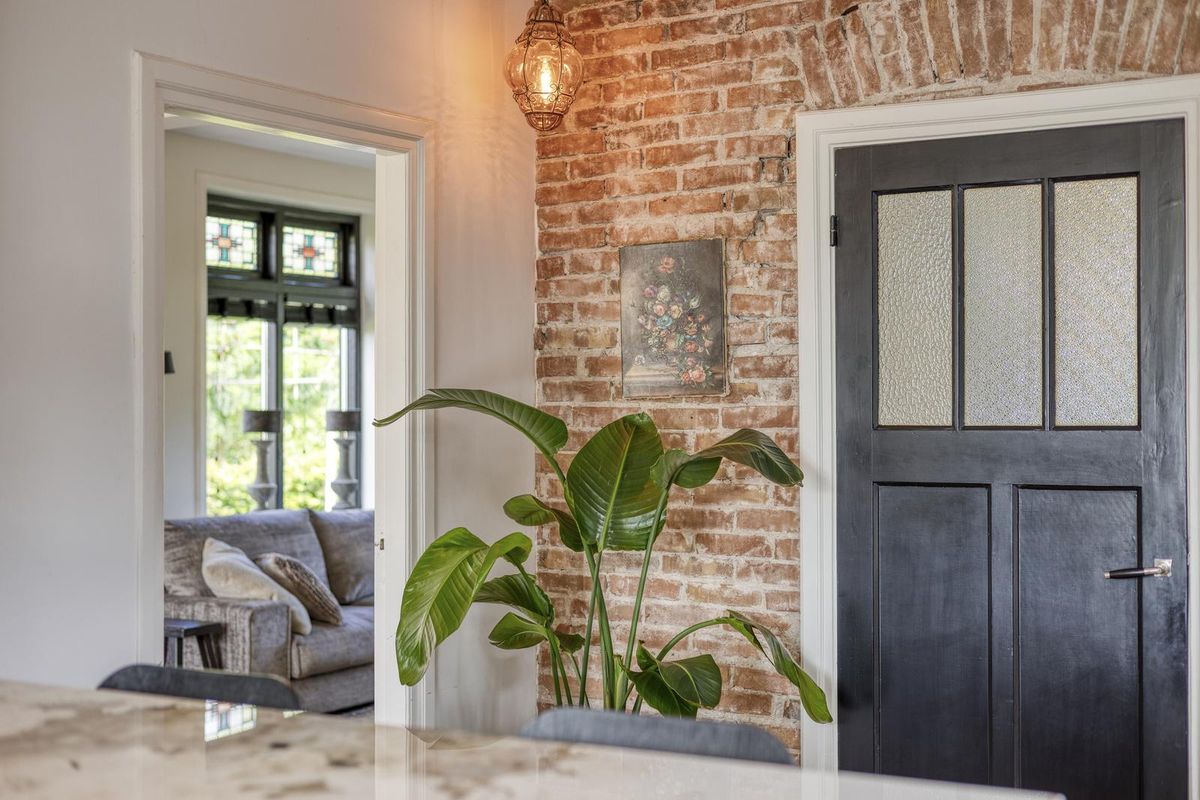 Via de bijkeuken stap je de luxueuze keuken in. Deze biedt niet alleen een prachtig blik op de tuin en de landerijen, het is ook een droom voor elke thuiskok. De keuken is opgedeeld in 2 delen, een spoelgedeelte en een schiereiland met kookgedeelte; een praktische indeling die zorgt voor maximale efficiëntie. Het schiereiland heeft tevens een keukenbar met zitgelegenheid voor meerdere personen. Uiteraard is de keuken van alle benodigde inbouwapparatuur voorzien, te weten een grote koelkast met vrieskast, Quooker (3 liter boiler), vaatwasser, heteluchtoven, combimagnetron en een inductiekookplaat met geïntegreerde brede afzuiging met plasmafilter. De keuken is afgewerkt met een Dekton aanrechtblad. Het zichtbare metselwerk en de geïntegreerde kast herinneren aan de oorspronkelijke bouw en voegt veel sfeer en charme toe aan het interieur.