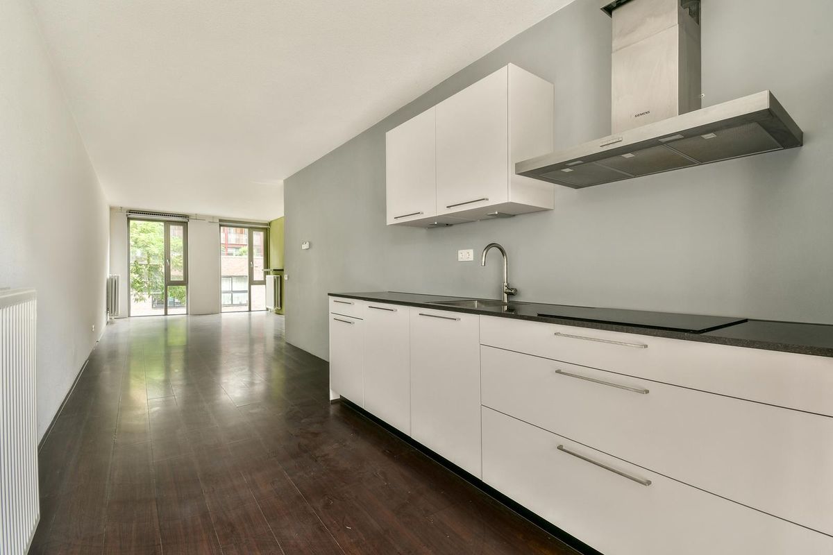 Aan de voorzijde van het appartement bevindt zich de ruime en lichte woonkamer, dankzij de grote raampartijen die zorgen voor een prettige lichtinval. Aangrenzend ligt de open keuken, uitgevoerd in een neutrale witte kleurstelling. De keuken is voorzien van diverse inbouwapparatuur, waaronder een 4-pits inductiekookplaat met afzuigkap, een vaatwasser en een separate koel-vriescombinatie, ideaal voor dagelijks gemak.