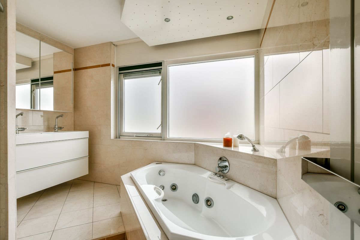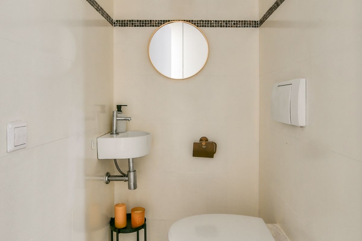 De badkamer bevindt zich aan de achterzijde van de woning en is stijlvol ingericht met een ligbad, douche, dubbele wastafel met meubel en een tweede toilet. Aangrenzend bevindt zich een praktische wasruimte, ideaal voor het plaatsen van een wasmachine en droger.