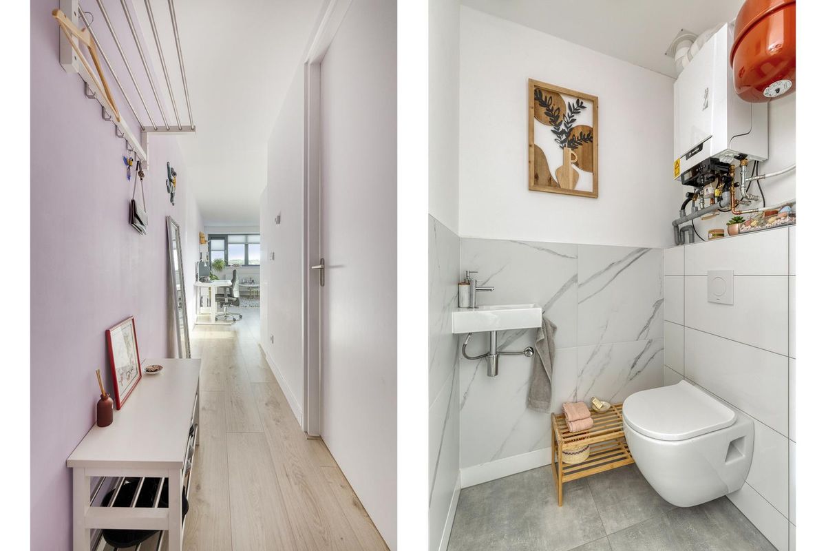 Je komt binnen via de gezamenlijke entree van het complex. Een nette, verzorgde entreehal leidt je naar het appartement. In de gang van de woning bevindt zich een modern afgewerkt, apart toilet, altijd fijn voor gasten!
