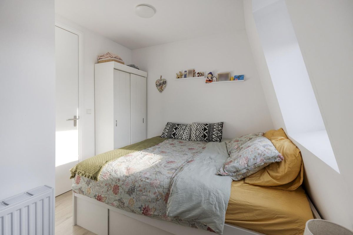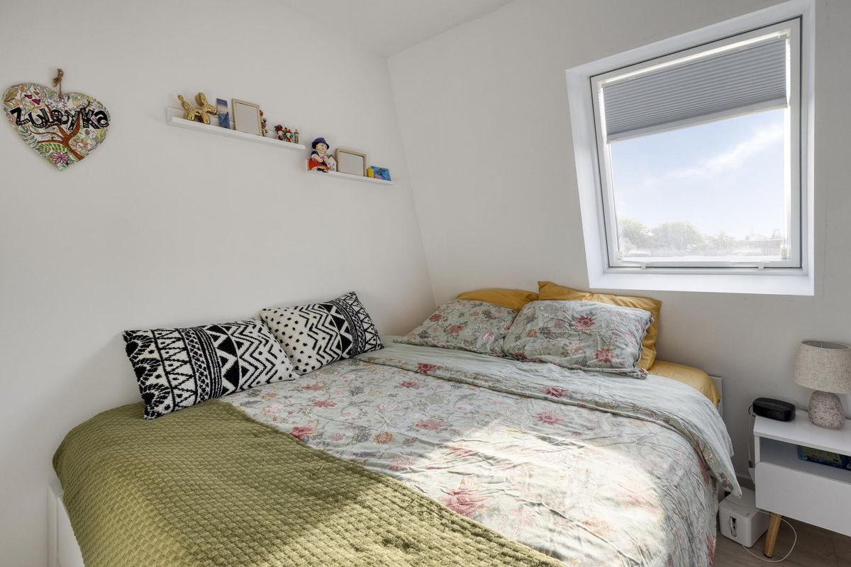 De slaapkamer is een prettige, lichte ruimte met strak afgewerkte witte wanden en een groot raam. De badkamer grenst direct aan de slaapkamer en is stijlvol uitgevoerd met een ruime douche en een wastafel met modern meubel. Alles keurig netjes en direct klaar voor gebruik!