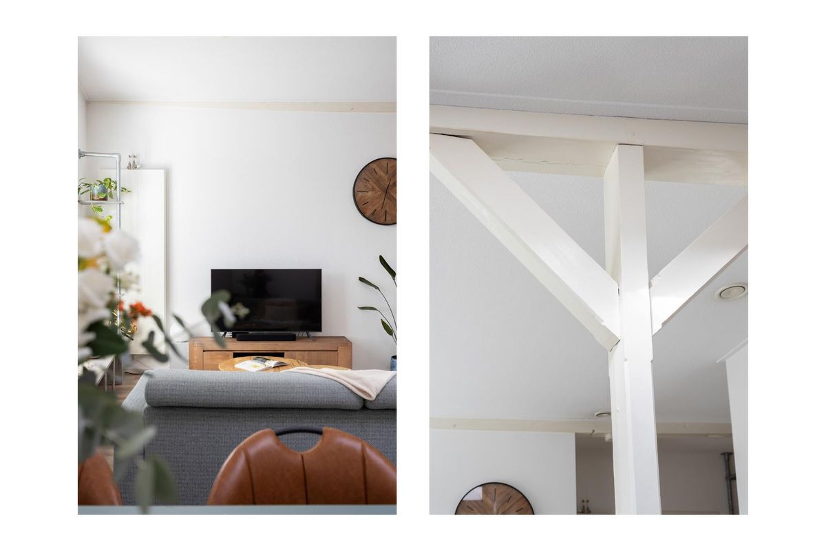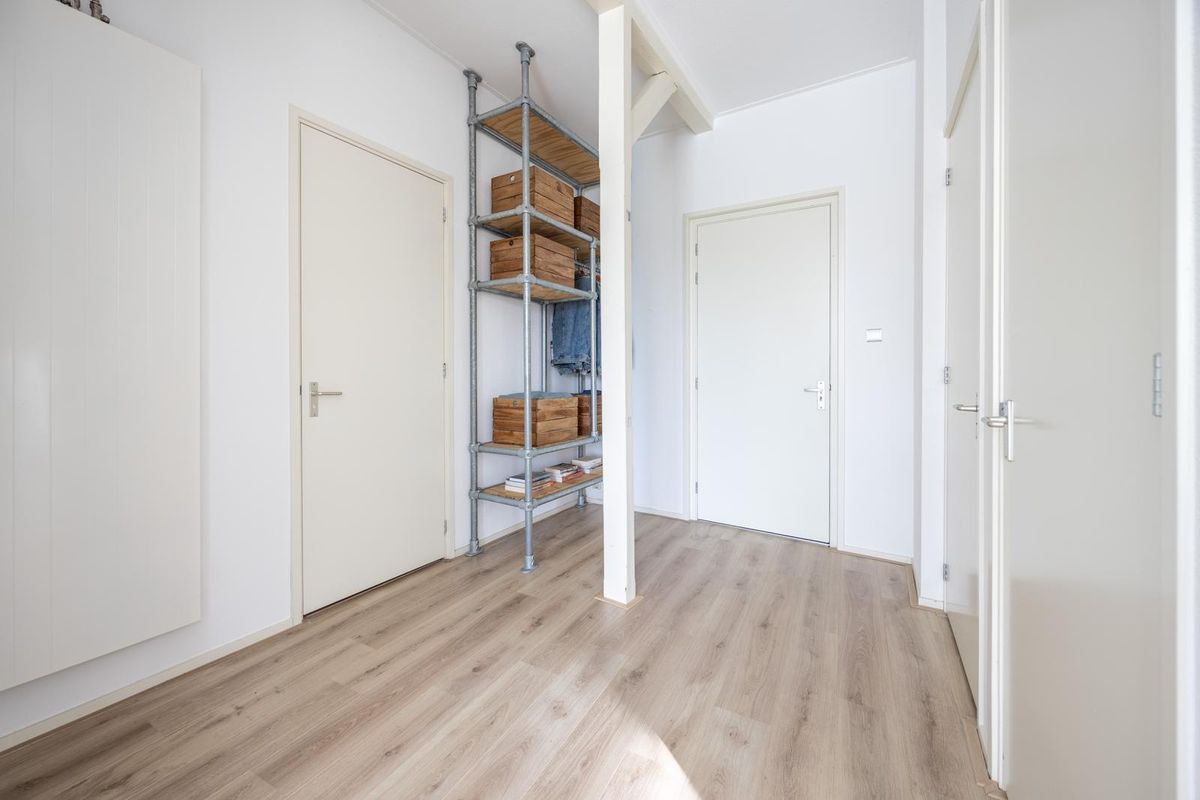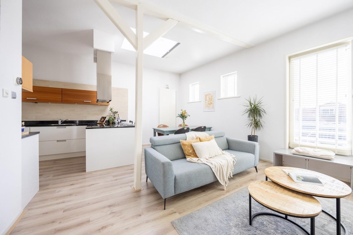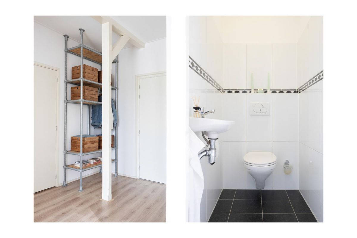 Je stapt de ruime hal in, die in open verbinding met de woonkamer staat. De laminaatvloer ligt in bijna het hele appartement en wat opvalt is het circa 3 meter hoge plafond, waardoor het appartement een loftachtige uitstraling heeft. Links in de hal zijn de toiletruimte met fonteintje en een berging, waar de wasmachine en eventuele droger kunnen staan.