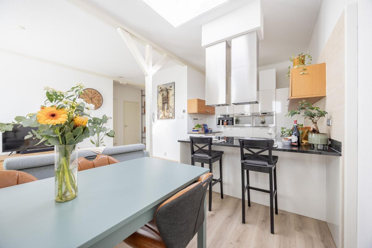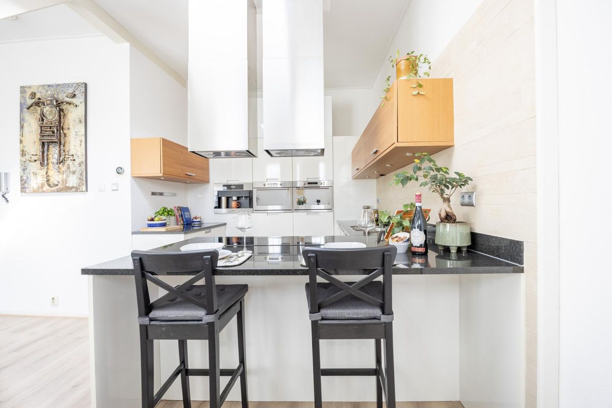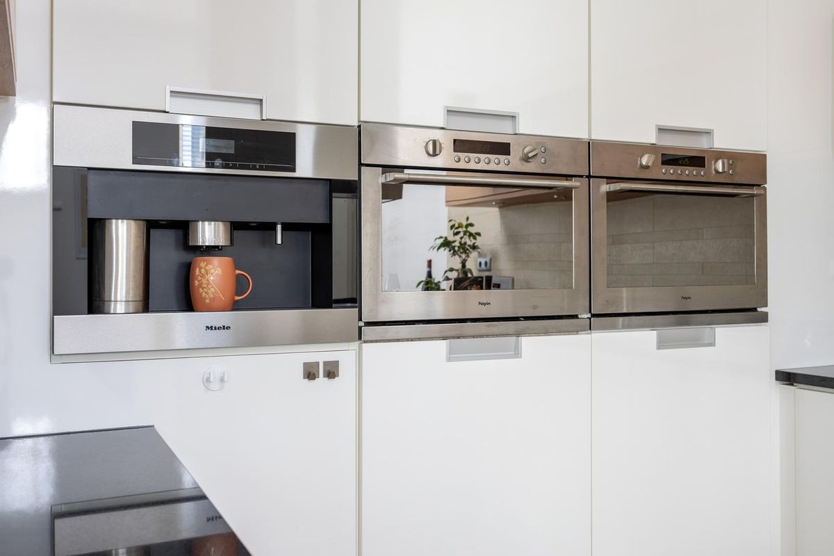 De woonkamer met open keuken is een fraaie, lichte en goed in te delen leefruimte met een lichtkoepel en grote ramen aan de zuidwestkant. Voor een heerlijke bank, een tv-meubel, de eettafel en je favoriete woonaccessoires is genoeg plek. In de keuken staat een kwalitatief goede opstelling aan vier zijden, met een granieten aanrechtblad en meer dan genoeg bergruimte. De inductie kookplaat, dubbele afzuigkap, vaatwasser, twee combi-ovens, koffiemachine, koelkast en vriezer zijn ingebouwd.