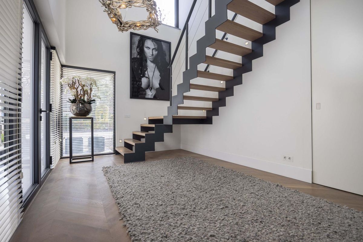 De stijlvolle entree met vide geeft u bij binnenkomst een warm welkom in deze moderne villa. De hoge plafonds en het vele lichtinval creëren direct een gevoel van ruimte en luxe. De verdiepingshoge, greeploze deuren leiden naar de living en vormen samen met de eiken houten vloer in 'Hongaarse punt' een elegant geheel dat warmte en stijl uitstraalt.