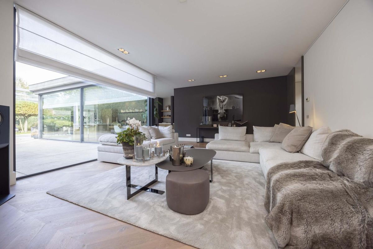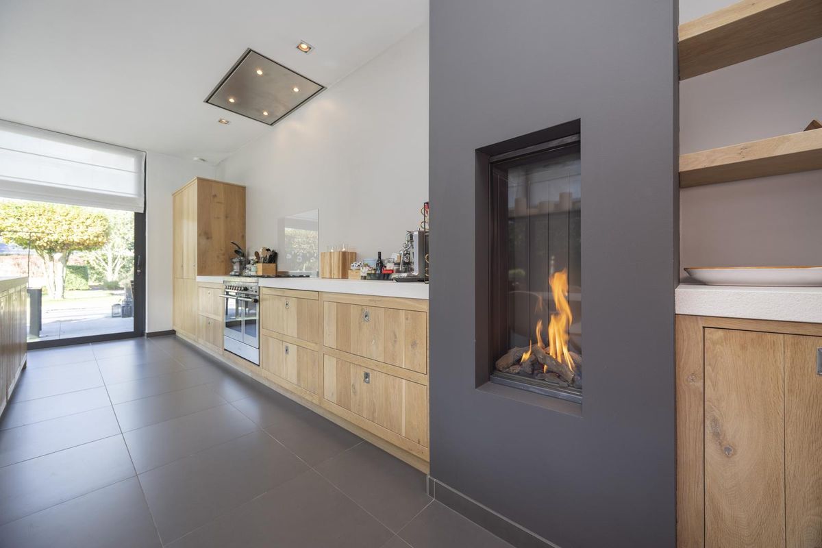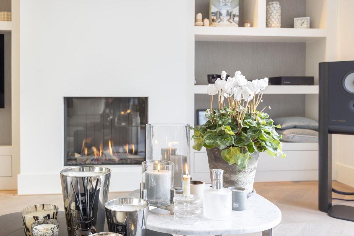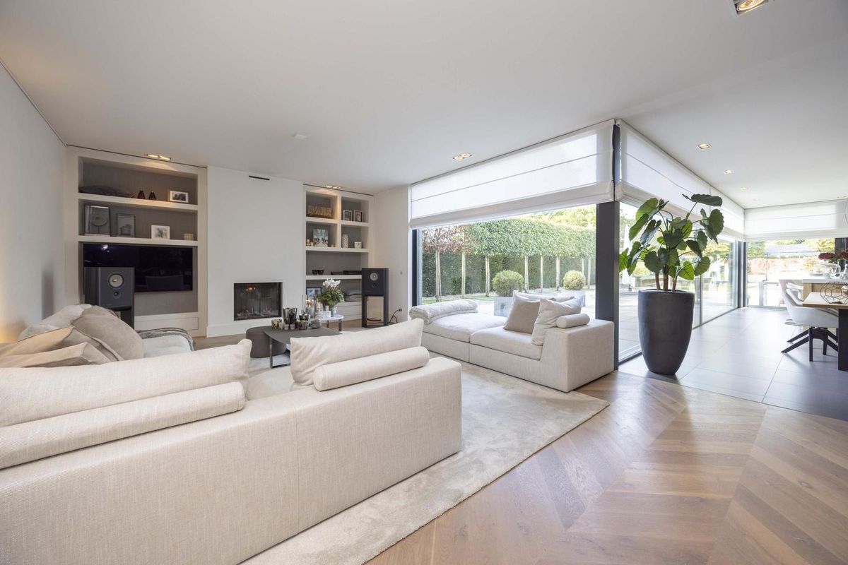 De living en woonkeuken staan in open verbinding met elkaar. In beide ruimtes is een moderne gashaard subtiel geïntegreerd in een maatwerk kastenwand en strakke schouw, wat zorgt voor een harmonieuze eenheid. Dankzij de verdiepingshoge raampartijen, met elektrisch bedienbare screens en gordijnen, en de schuifpui aan de achterzijde van de keuken is er een fraai lichtinval op de gehele parterre. Vanuit elke hoek is er een fraai uitzicht op de modern aangelegde, verzorgde achtertuin. Het binnen- en buitenleven vloeien hierdoor harmonieus in elkaar over, wat het gevoel van