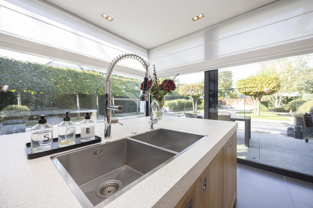 wijze geïntegreerd. Het royale kookeiland biedt niet alleen extra werkruimte, maar ook een dubbele spoelunit met Quooker en een sfeervol zitgedeelte aan de bar. De tegelvloer, greeploze kasten en subtiele inbouwspots zorgen voor een
