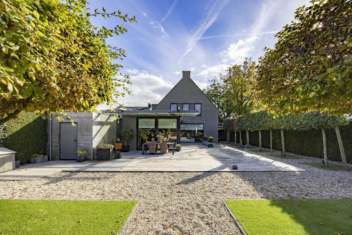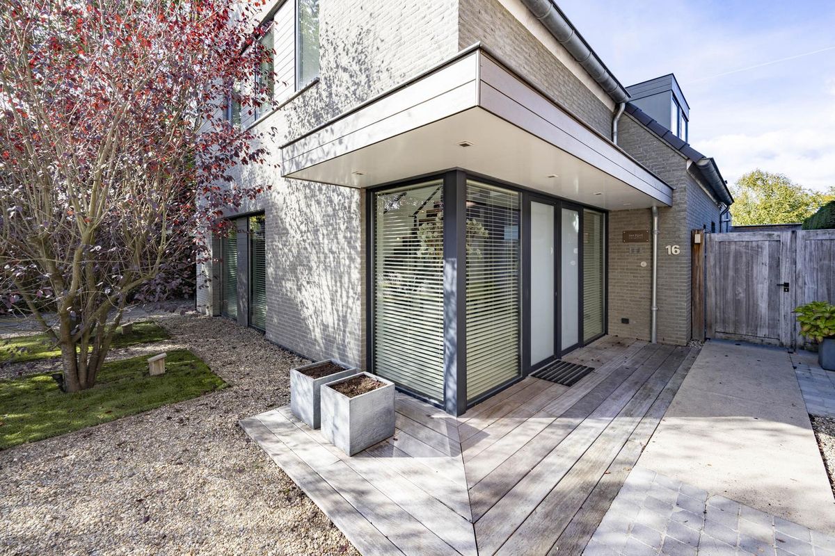 De moderne stijl van de woning wordt buiten voortgezet in de fraai, aangelegde, strak afgewerkte tuin die met zorg is onderhouden en een prachtige eenheid vormt met de woning. Direct aangrenzend aan de woning is een groot, deels overdekt, terras te betreden. De tuin kent veel privacy en is met een eigen achterom te betreden.