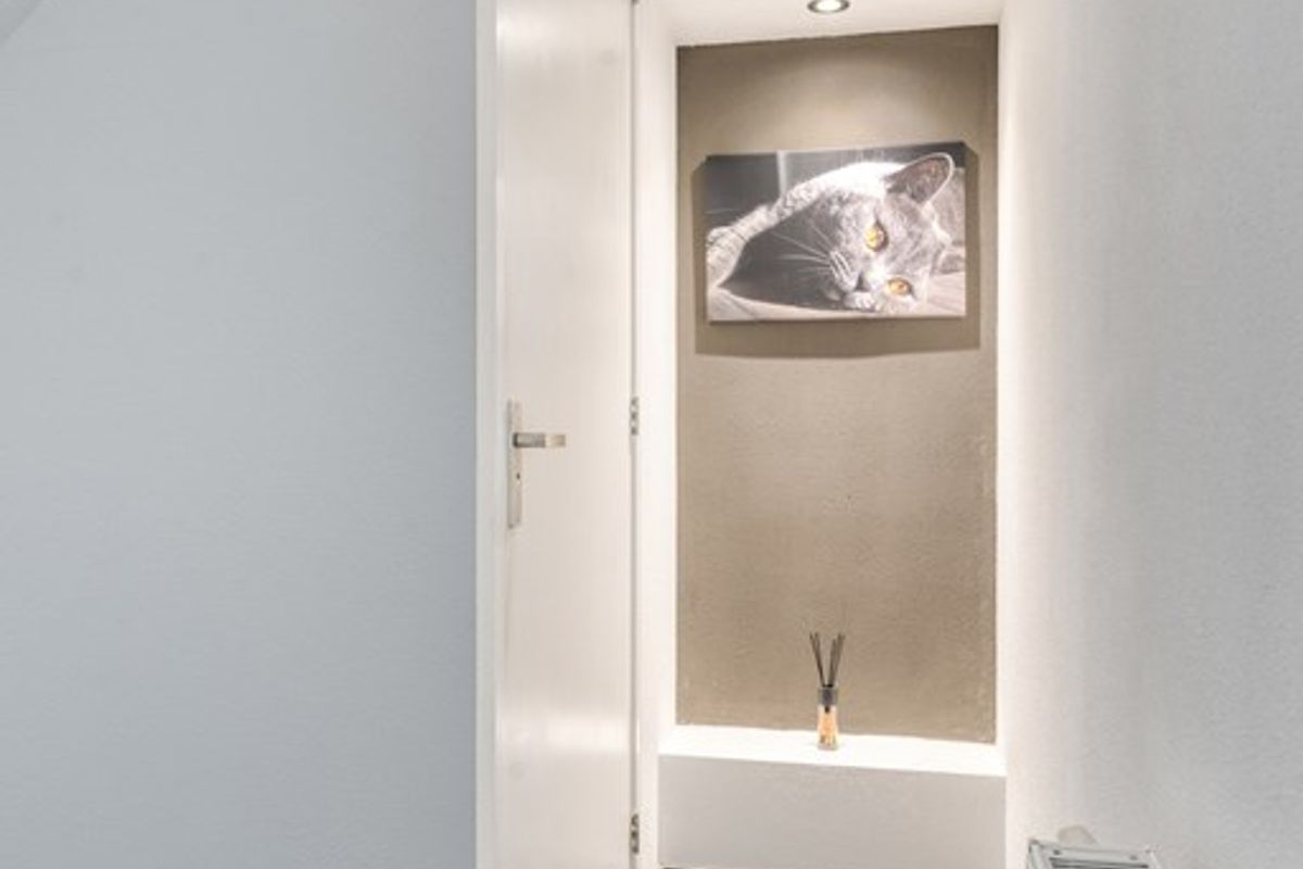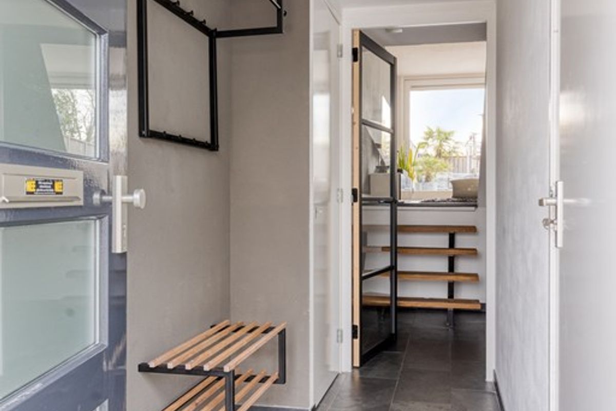 Bij binnenkomst komt u in de entreehal, waar direct de verzorgde afwerking opvalt. Hier heeft u toegang tot de inpandige berging en de leefruimte. Aan de rechterzijde van de hal bevindt zich het toilet.