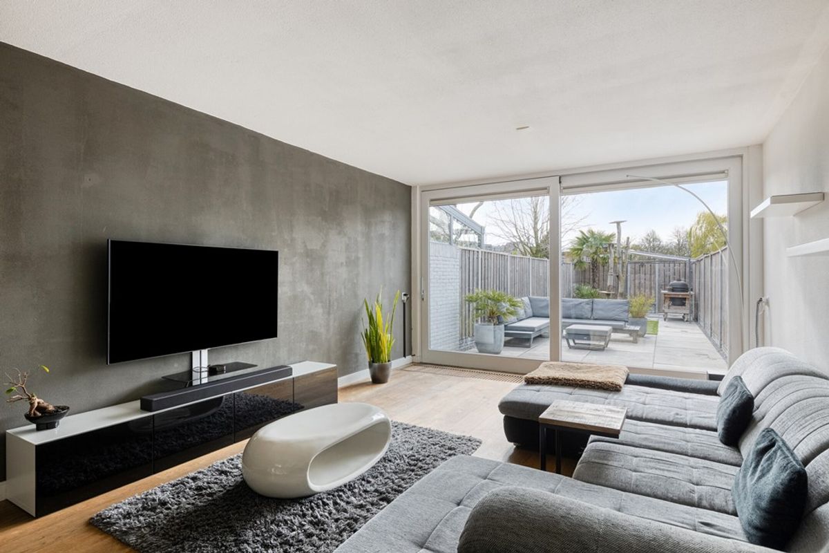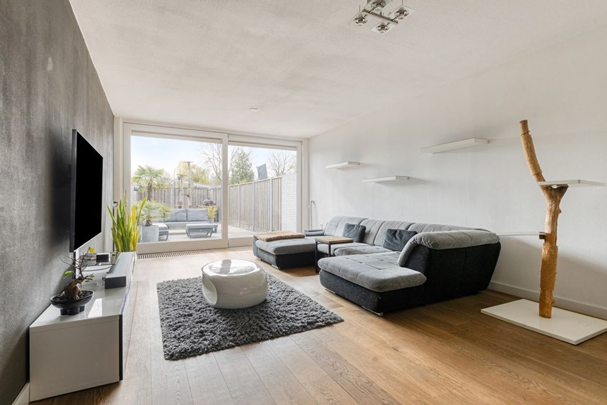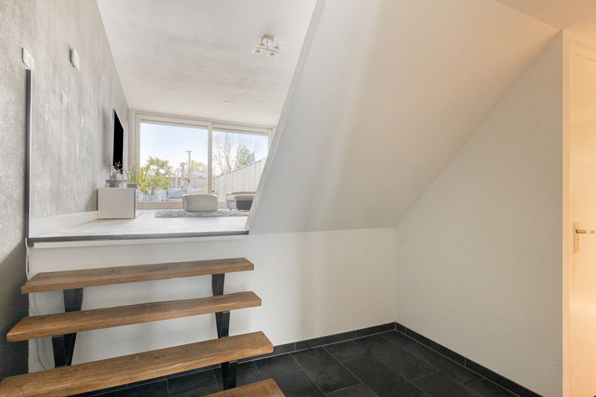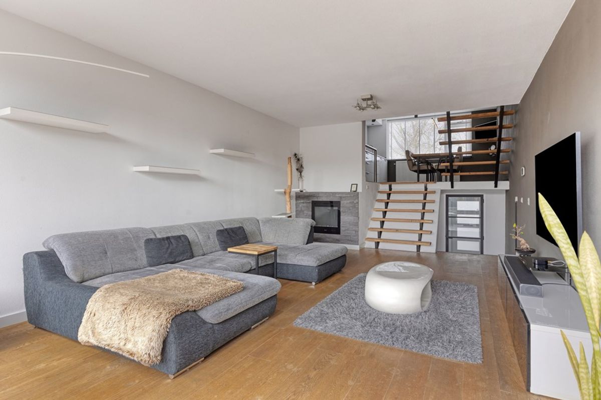 En dan begint het spel van niveaus. Enkele treden brengen u naar de woonkamer, die zich kenmerkt door de open opzet en de prettige lichtinval. De grote schuifpui aan de achterzijde zorgt voor een mooie verbinding met de tuin en maakt dit een fijne plek om te ontspannen. De sfeerhaard en de moderne afwerking geven de ruimte extra warmte en uitstraling.