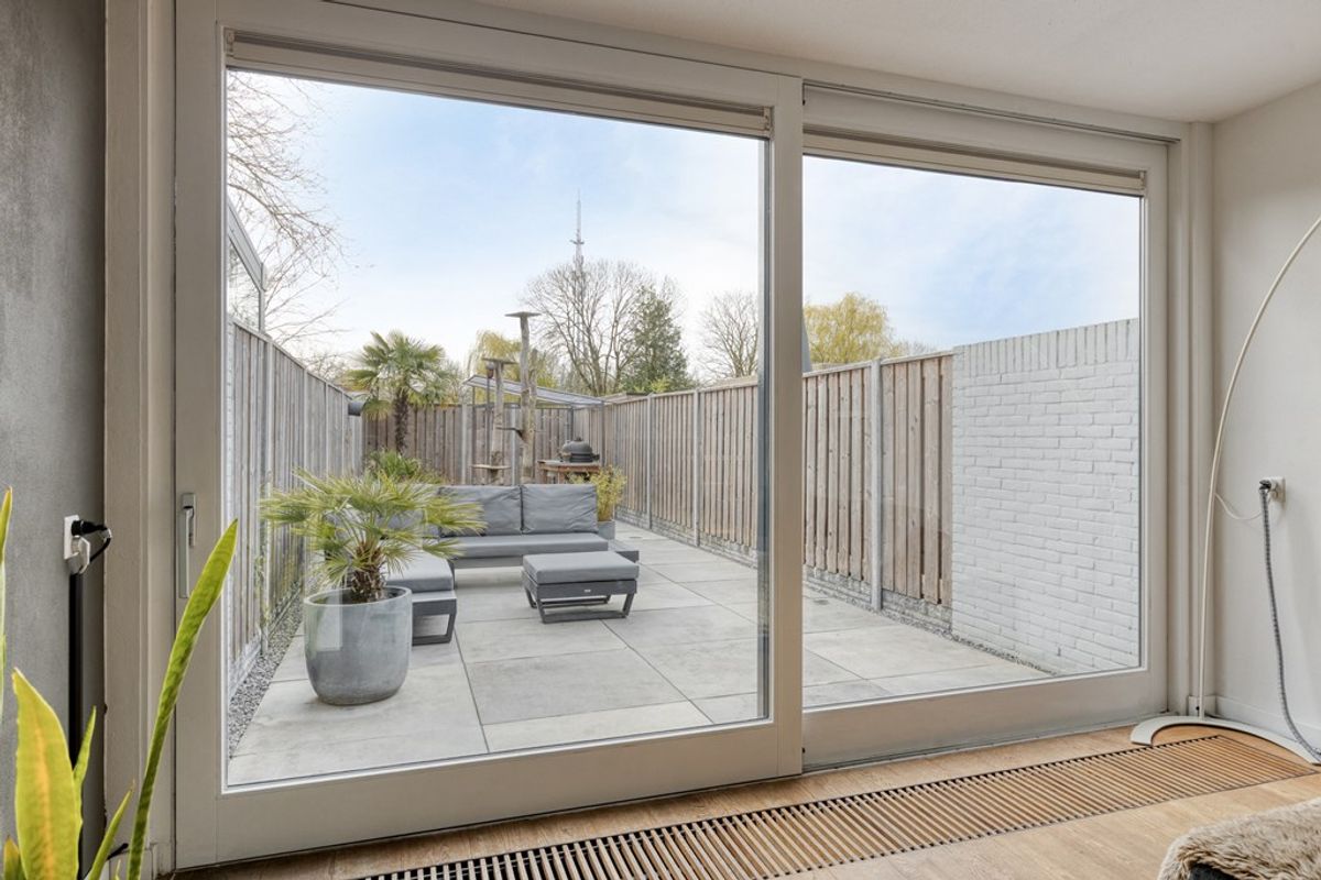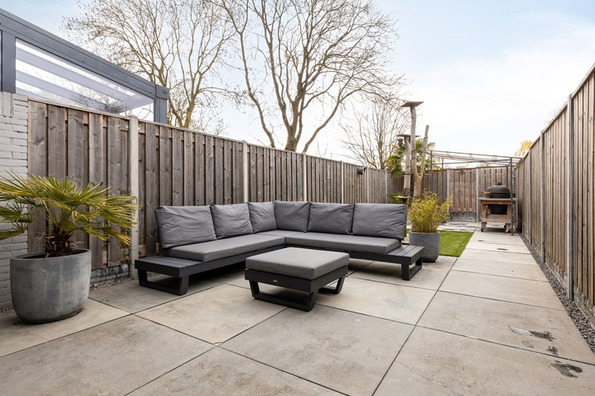 De diepe achtertuin is strak en onderhoudsvriendelijk aangelegd, met een combinatie van bestrating en groen. Het ruime terras is voorzien van een uitvalscherm en achterin is een overkapping gerealiseerd, ideaal voor een barbecue. De tuin is verzorgd en biedt voldoende privacy. Aan de voorzijde beschikt u over parkeergelegenheid op eigen terrein, wat het dagelijkse gemak compleet maakt.