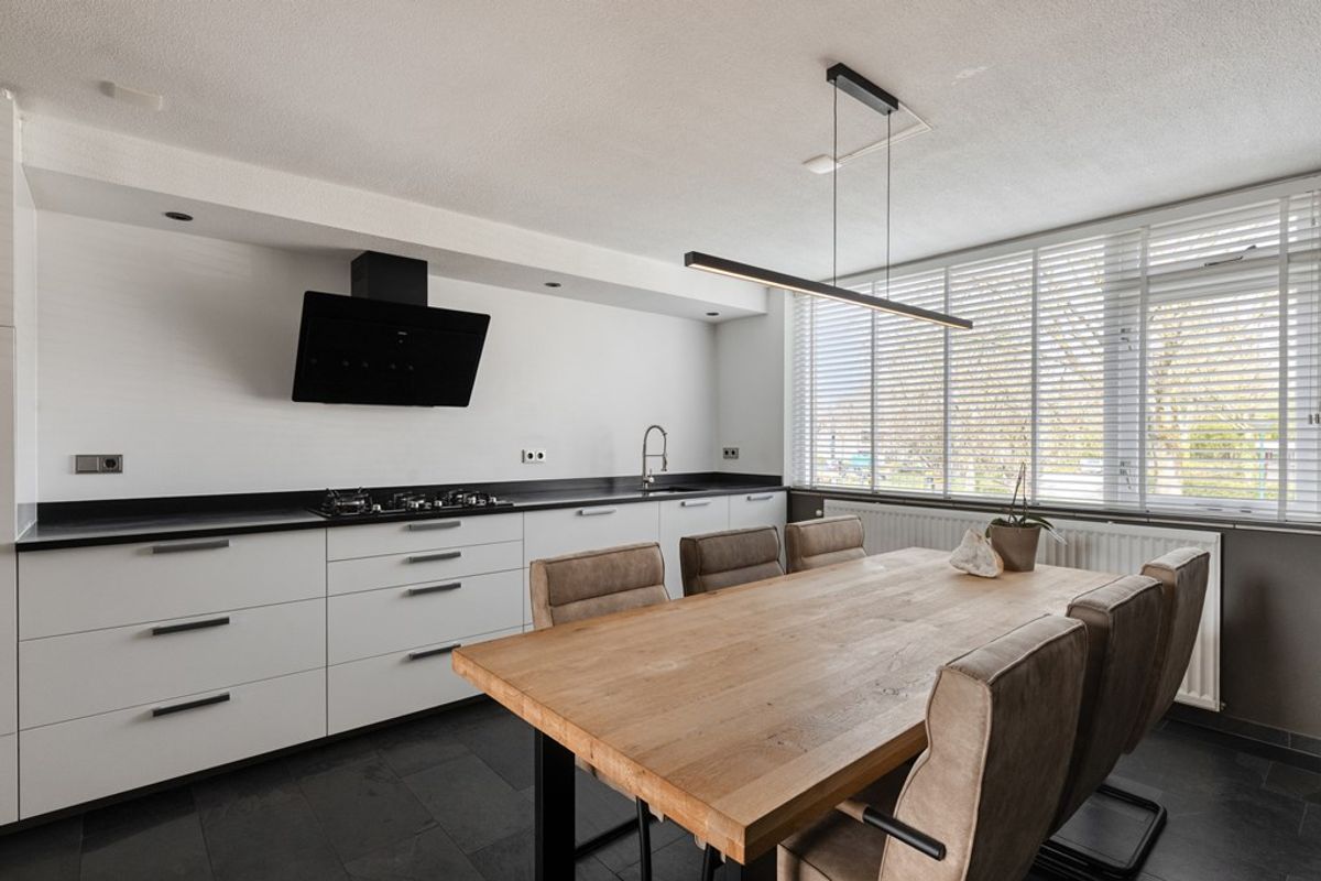 Een halve verdieping hoger bevindt zich de keuken, die ruim is opgezet en voldoende plek biedt voor een grote eettafel. Hier kijkt u uit over de straatzijde, terwijl u toch een fijne, rustige plek heeft om uitgebreid te tafelen. De keuken is modern uitgevoerd en sluit mooi aan bij de rest van de woning.