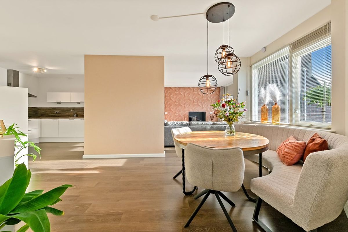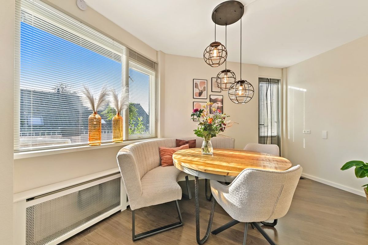 Via de galerij kom je bij de entree van de woning met hal, geheel betegelde toiletruimte met zwevend toilet en fonteintje. De ruime en lichte woonkamer, fraaie laminaatvloer en grote bergkast onder de trap is dankzij de waaiervorm verrassend sfeervol ingedeeld. Vanuit de woonkamer is het eerste dakterras bereikbaar over de gehele breedte van het zitgedeelte. Aan de buitenzijde zijn elektrische zonwerende screens (2021) geplaatst. Het tweede terras is bereikbaar vanuit de eetkamer. Dit verrassend ruime terras op het zuiden, met vrij uitzicht over de historische kern van Maasland, is voorzien van een mooie houten terrasvloer. Door de afmetingen kun je dit dakterras sfeervol inrichten. Aan de voorzijde van het appartement staat de moderne open keuken opgesteld in een U-vorm met diverse inbouwapparatuur waaronder een vaatwasmachine, koel- vriescombinatie (2021), 4-pits gaskookplaat met aparte wok brander, RVS-afzuigkap en combi-oven magnetron. De keuken is uitgevoerd in een lichte kleurencombinatie.