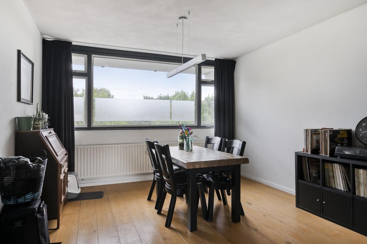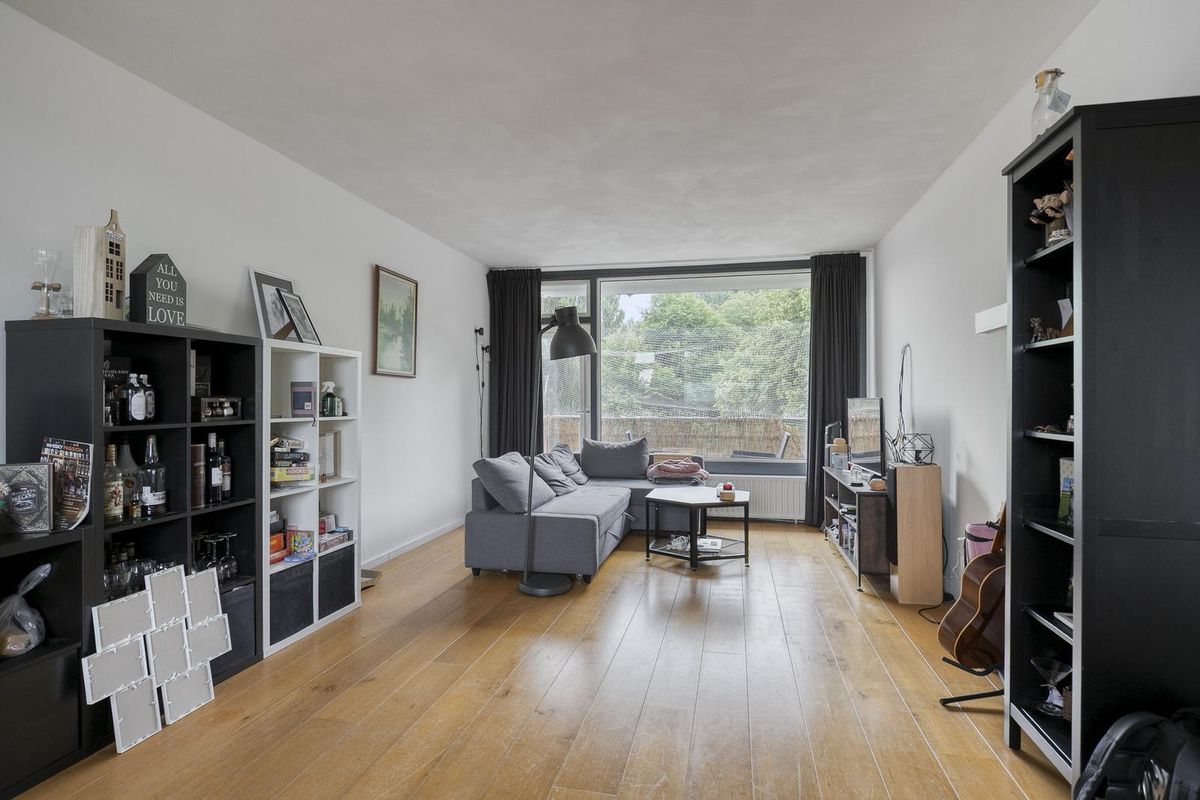 De woonkamer beslaat de gehele diepte van het appartement en heeft een oppervlakte van ongeveer 32 m2. Zowel aan de voorzijde als aan de achterzijde zijn er grote raampartijen waardoor dit een hele lichte kamer is. Aan de achterzijde is er toegang tot het balkon via een loopdeur. Ook de woonkamer heeft de eerder vermeldde houten vloer en stucwerk wandafwerking.