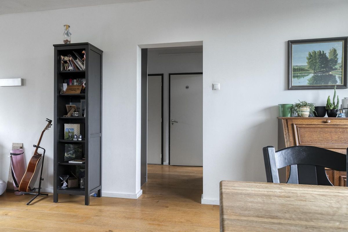 Centrale hal met toegang tot alle kamers en de intercominstallatie. De wanden zijn voorzien van stucwerk en op de vloer ligt een houten vloer die ook doorloopt in de slaapkamers.