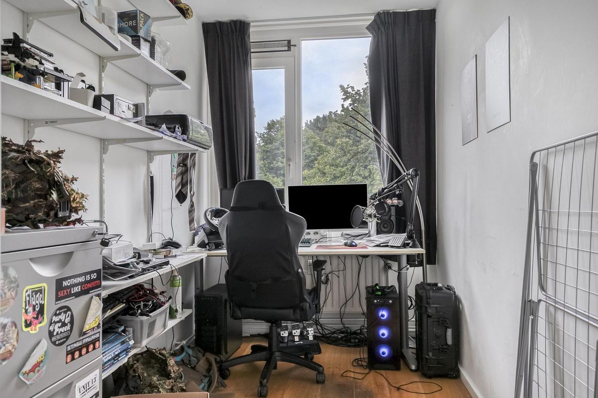 Aan de achterzijde bevindt zich een slaapkamer die thans in gebruik is als kantoorruimte. Ook hier zijn de wanden voorzien van stucwerk en is er een houten vloer. Het kozijn is kunststof met een draai-kiepraam voorzien van een ventilatierooster en dubbel glas.