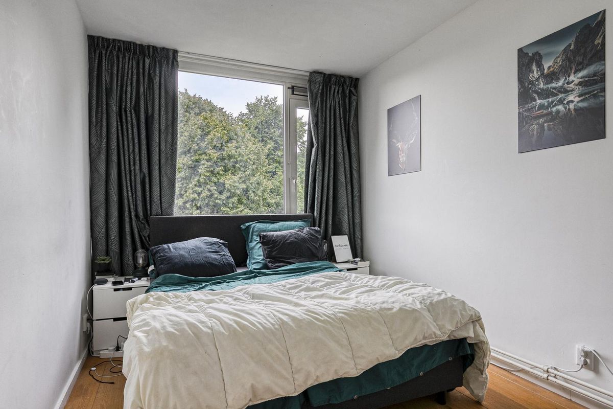 Dit is de grootste slaapkamer die net als de eerste slaapkamer voorzien is van een houten vloer, stucwerk wanden en een kunststof kozijn met een draai-kiepraam, een ventilatierooster en dubbel glas.