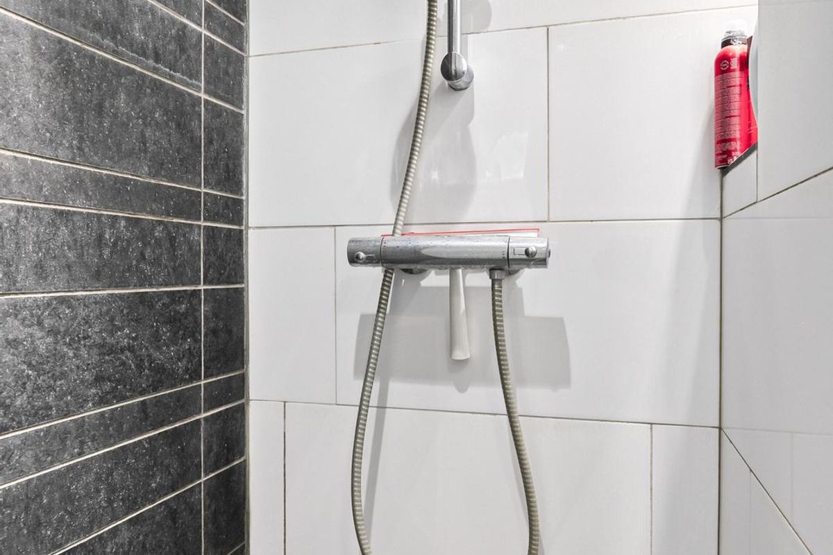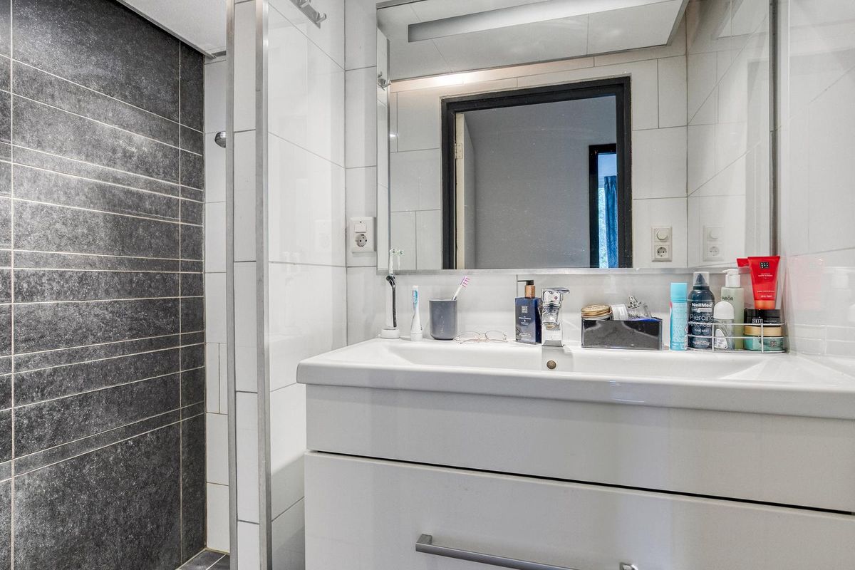 Deze is volledig betegeld met deels donkere en deels witte wandtegels. Er is een ruime inloopdouche met een thermostaatkraan en een wastafel in een badkamermeubel.