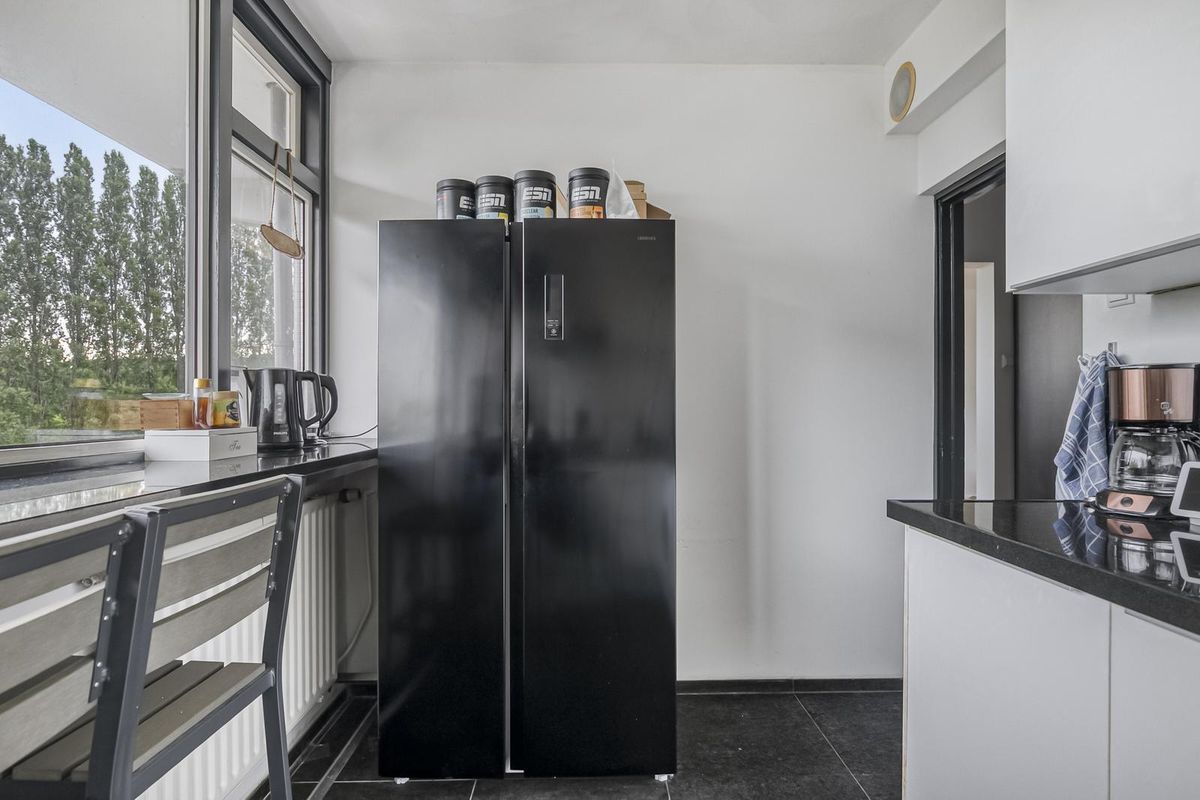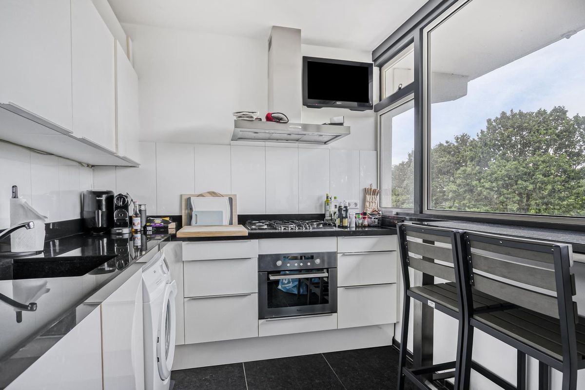 De moderne keuken is een aparte ruimte met een luxe keukeninrichting in een hoekopstelling voorzien van voldoende onder- en bovenkastjes. De keuken is afgewerkt met hoogglans witte fronten en RVS handgrepen en een donker hardstenen aanrechtblad. Als inbouwapparatuur heeft de keuken een 5 pits gaskookplaat met daarboven een RVS recirculatie-afzuigkap, een spoelbak en een vaatwasmachine. Daarnaast is er een losse koel-/vriescombinatie en bevindt zich in de keuken een aansluiting voor de wasmachine. De wasmachine blijft achter. De wanden zijn grotendeels voorzien van stucwerk en op de vloer liggen donkere tegels. De keuken ligt aan de galerijzijde en heeft over de volle breedte een raamkozijn (van hout) waardoor er een ideale lichtinval in de keuken is.