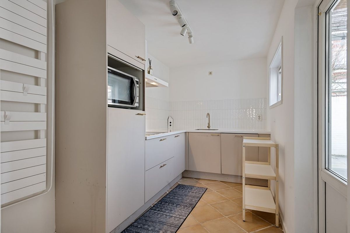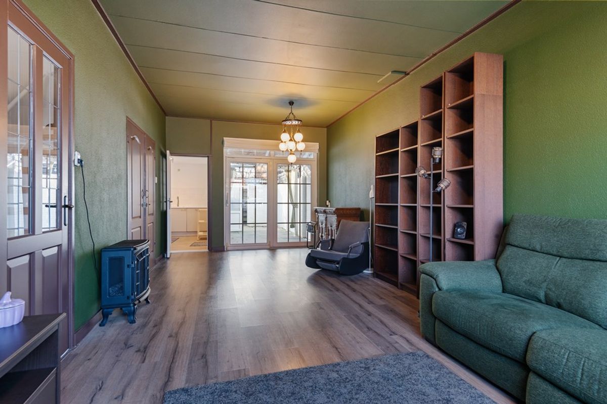 Adjacent to the living room, accessed through an intermediate door, are the toilet and the kitchen located in the extension. The modern corner kitchen is equipped with various built-in appliances, including a refrigerator, an induction hob with extractor hood, and a dishwasher. The backyard can be accessed from both the kitchen and the living room.