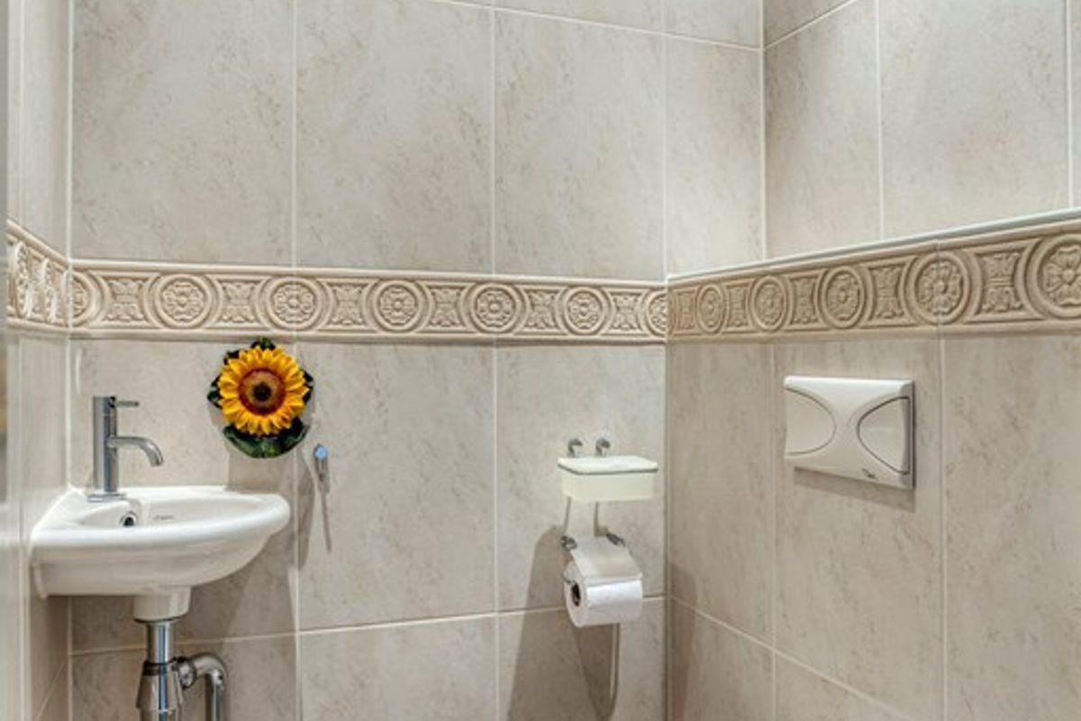 Overloop met bergkast ( met wasmachine aansluiting) en toegang tot de badkamer welke is voorzien van een 2e toilet, douchecabine, designradiator en wastafelmeubel .