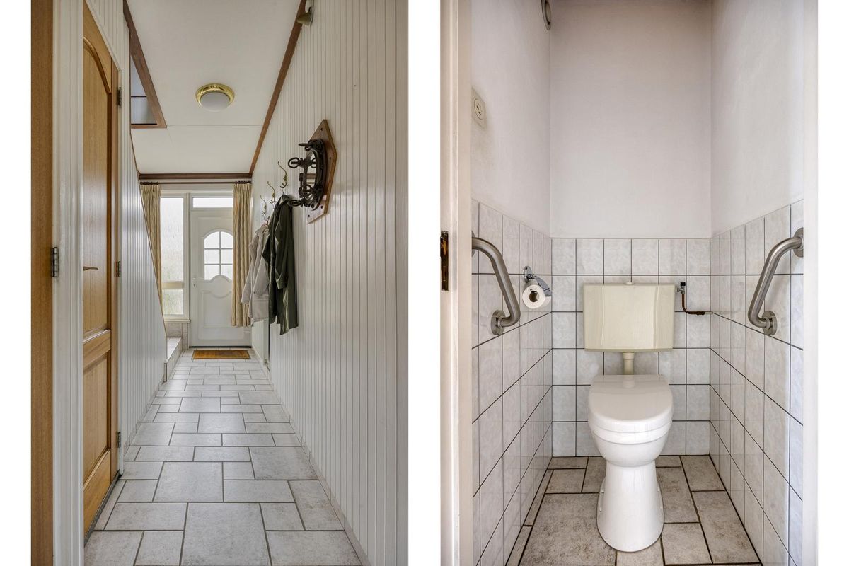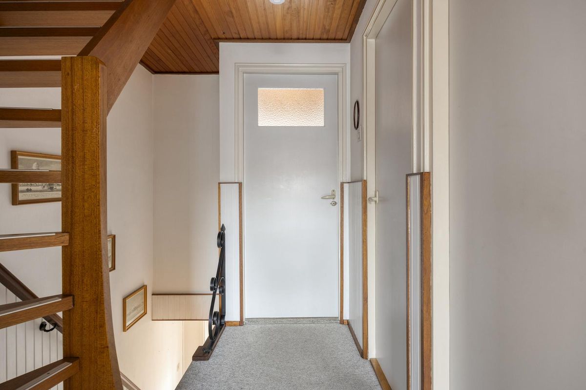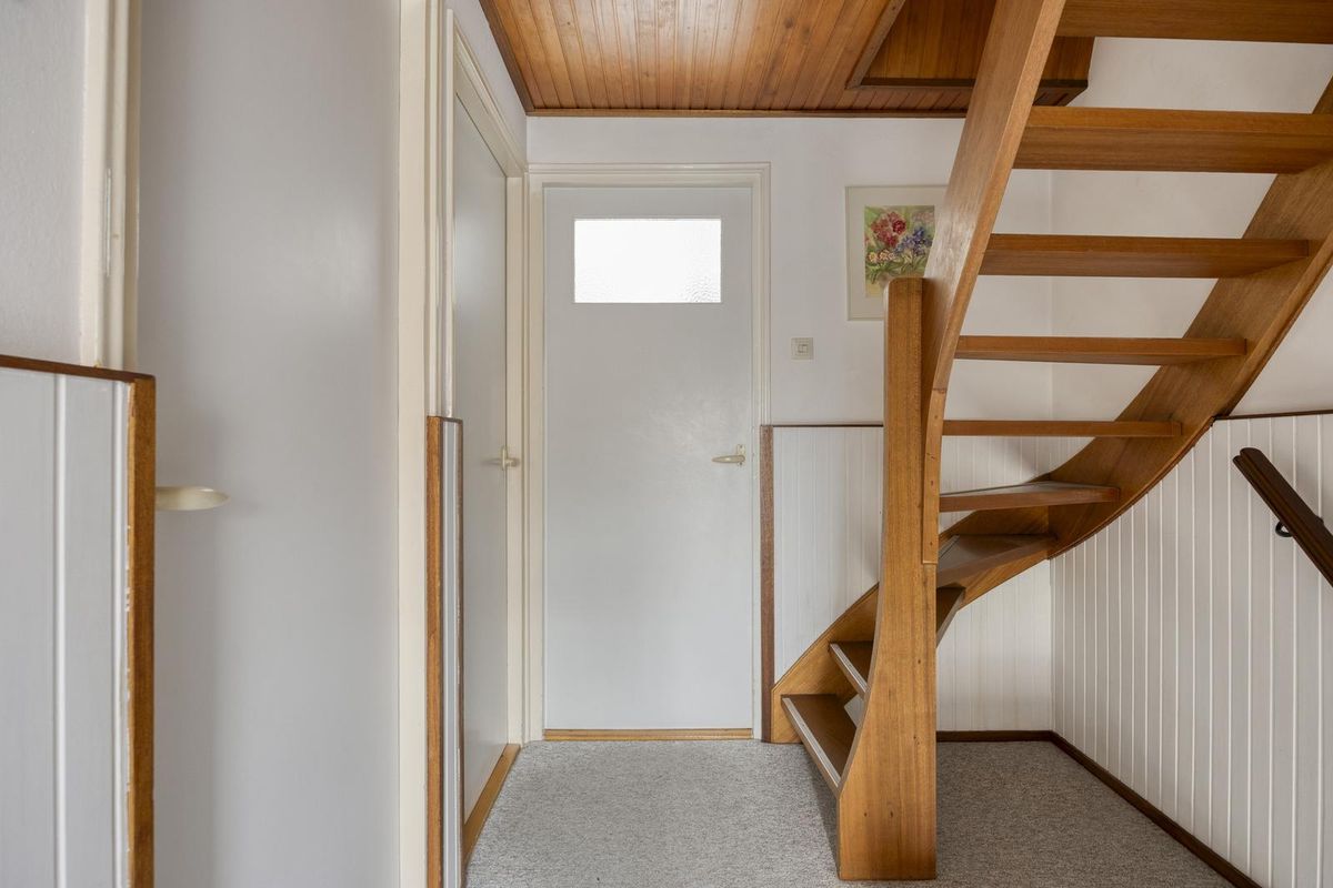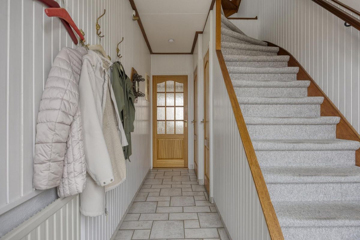 Je komt binnen in de hal met trapopgang. Een prettige, lichte binnenkomst die direct een warme eerste indruk geeft. Vanuit de hal heb je toegang tot de meterkast, het toilet, een trapkast, de woonkamer en een trap naar de eerste verdieping.