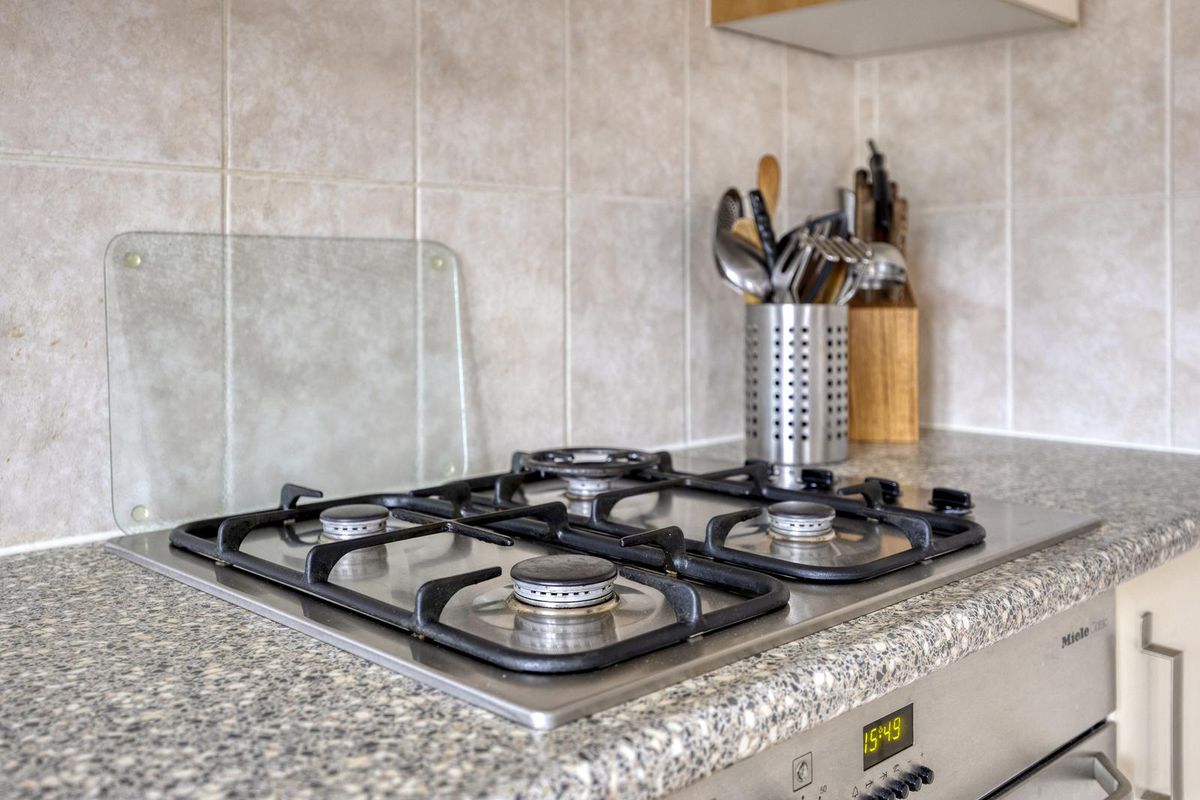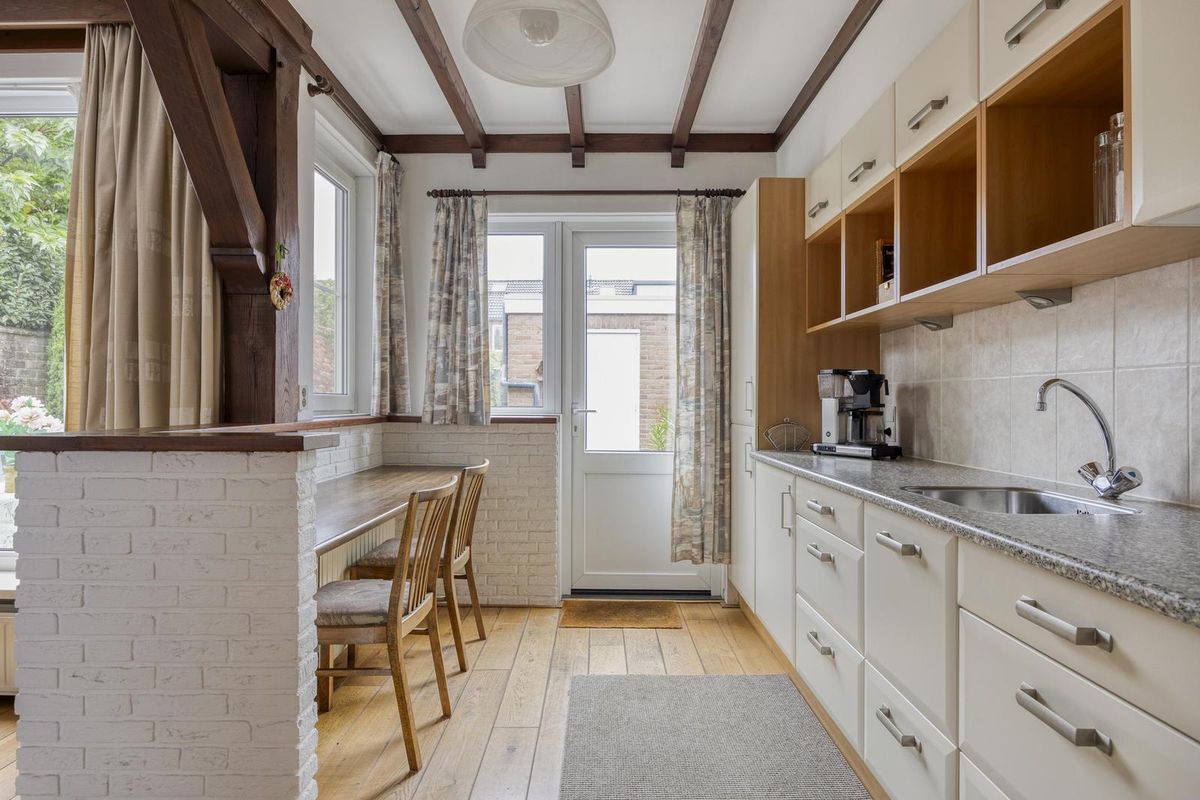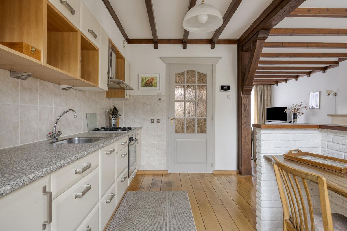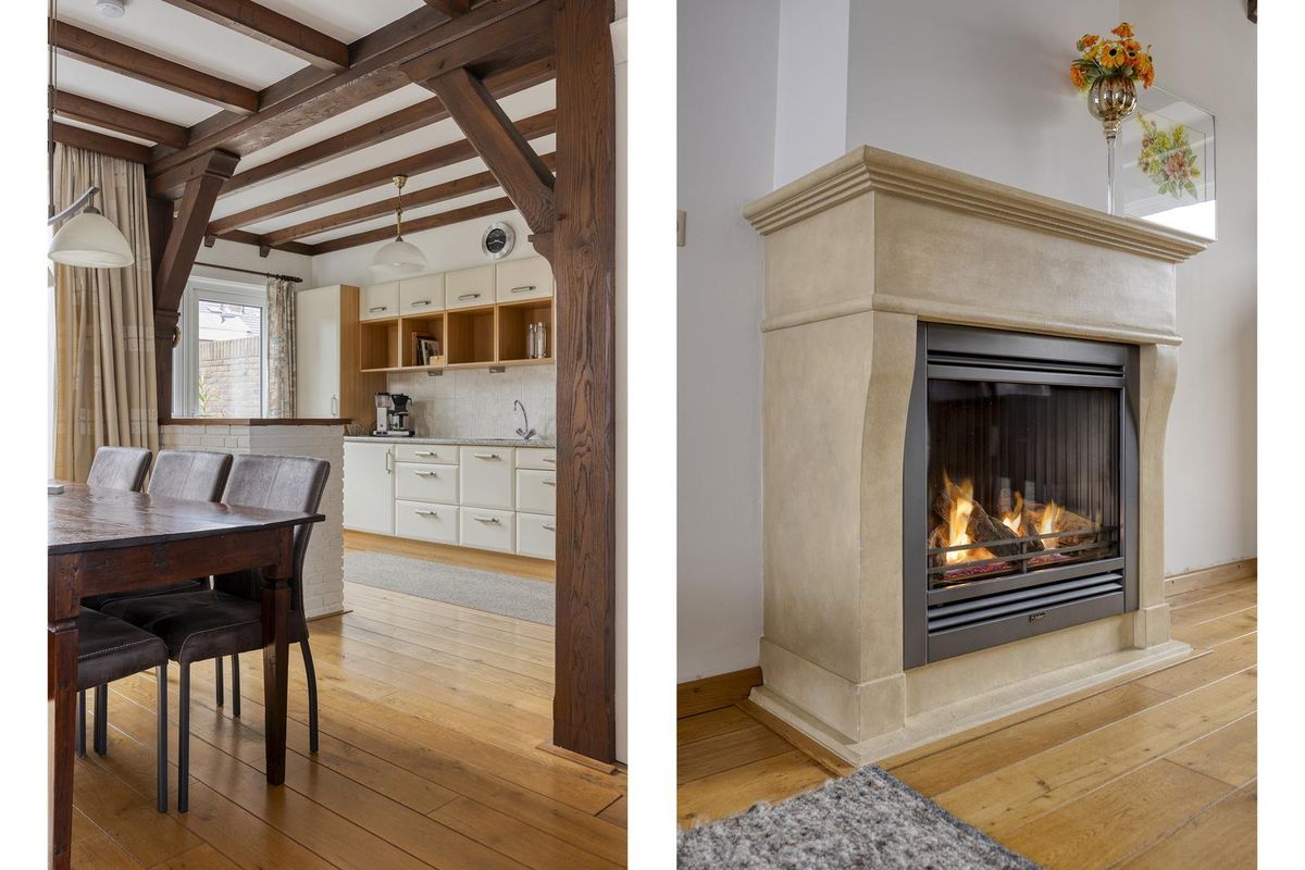 De woonkamer straalt warmte en gezelligheid uit dankzij de prachtige houten vloer en de sfeervolle gashaard. De open keuken zorgt voor een gezellige verbinding tussen koken en leven. De keuken is eenvoudig maar functioneel ingericht met een gasfornuis, oven en koelkast, perfect voor wie zelf nog een moderne twist wil toevoegen.