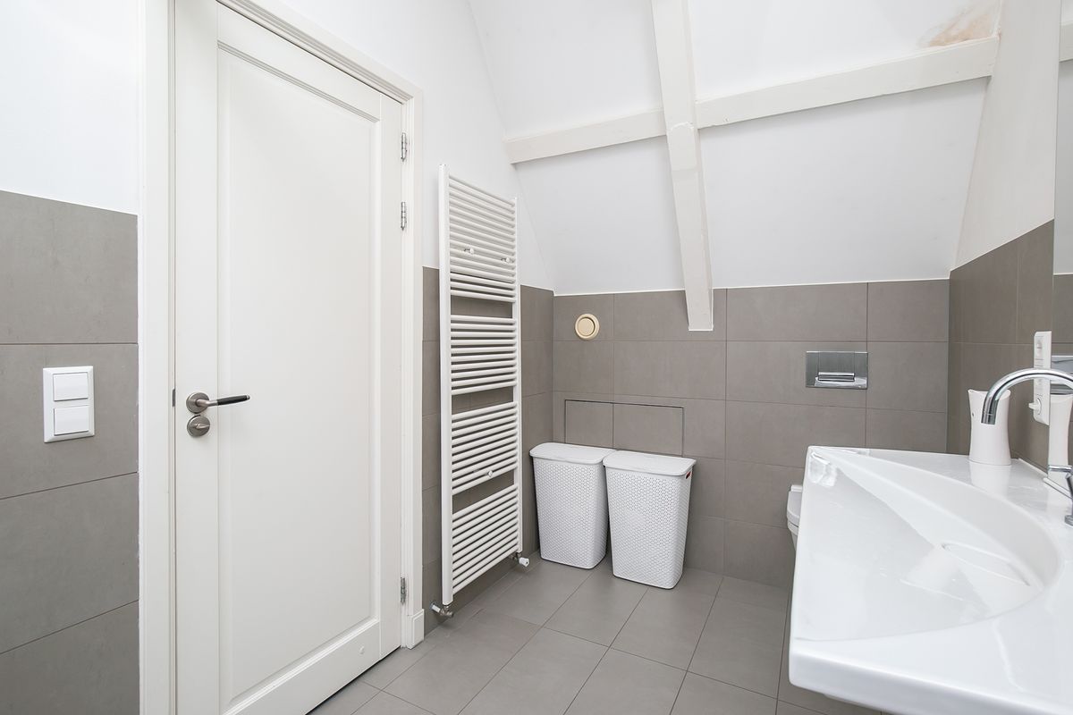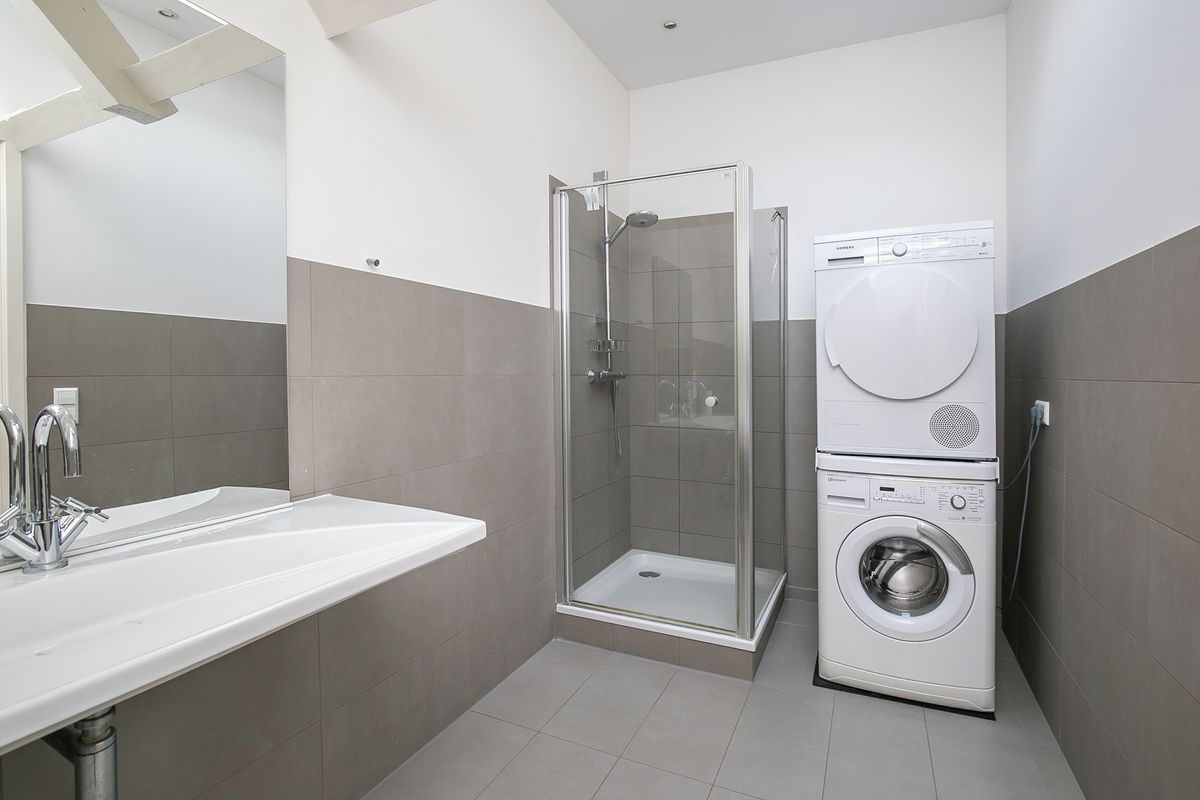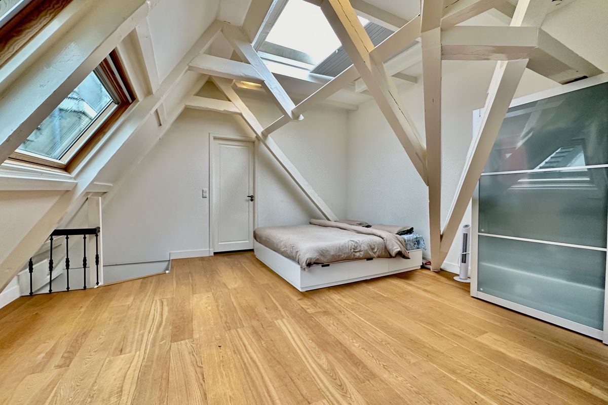 Third floor: Very spacious bedroom (30m²) which offers many possibilities for e.g. creating a study space, adjacent to the bathroom with walk-in shower, sink and toilet. This bedroom also gives a beautiful view over the backyards.