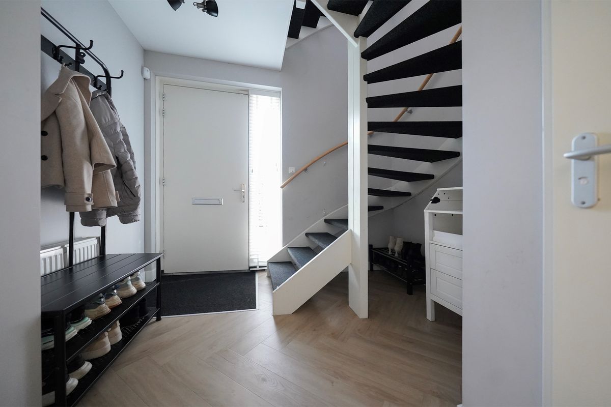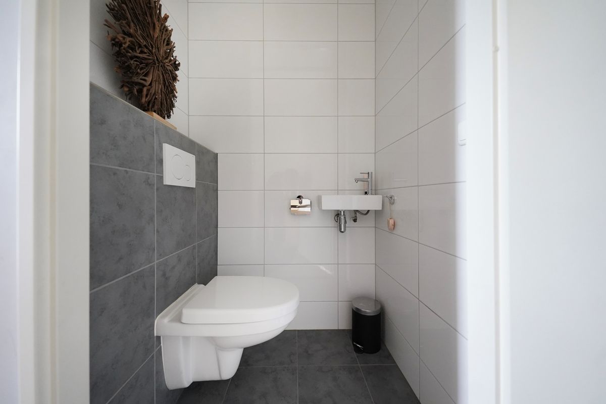 Er is een ruime oprit aanwezig waar gemakkelijk 2 auto’s kunnen parkeren. Via de voordeur, de openslaande deuren van de garage of achterom langs de garage loop je zo de woning binnen. Wij gaan officieel door de voordeur aan de zijgevel van de woning. De hal verraadt al de gezellige, neutrale sfeer in de woning waarbij de mooie visgraatvloer me meteen opvalt! Er is een open trap naar boven en de toiletruimte is voorzien van een hangend toilet met fonteintje.