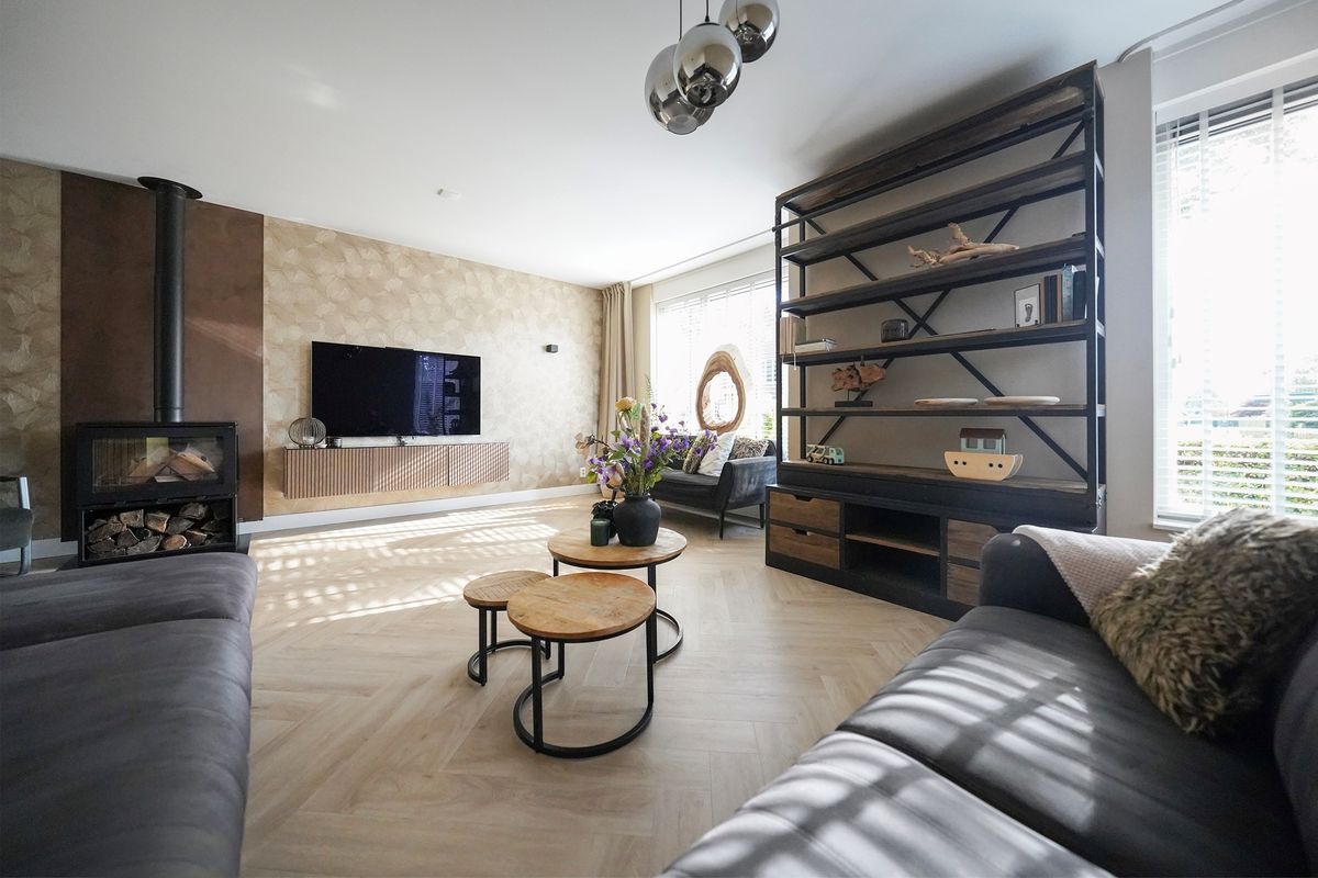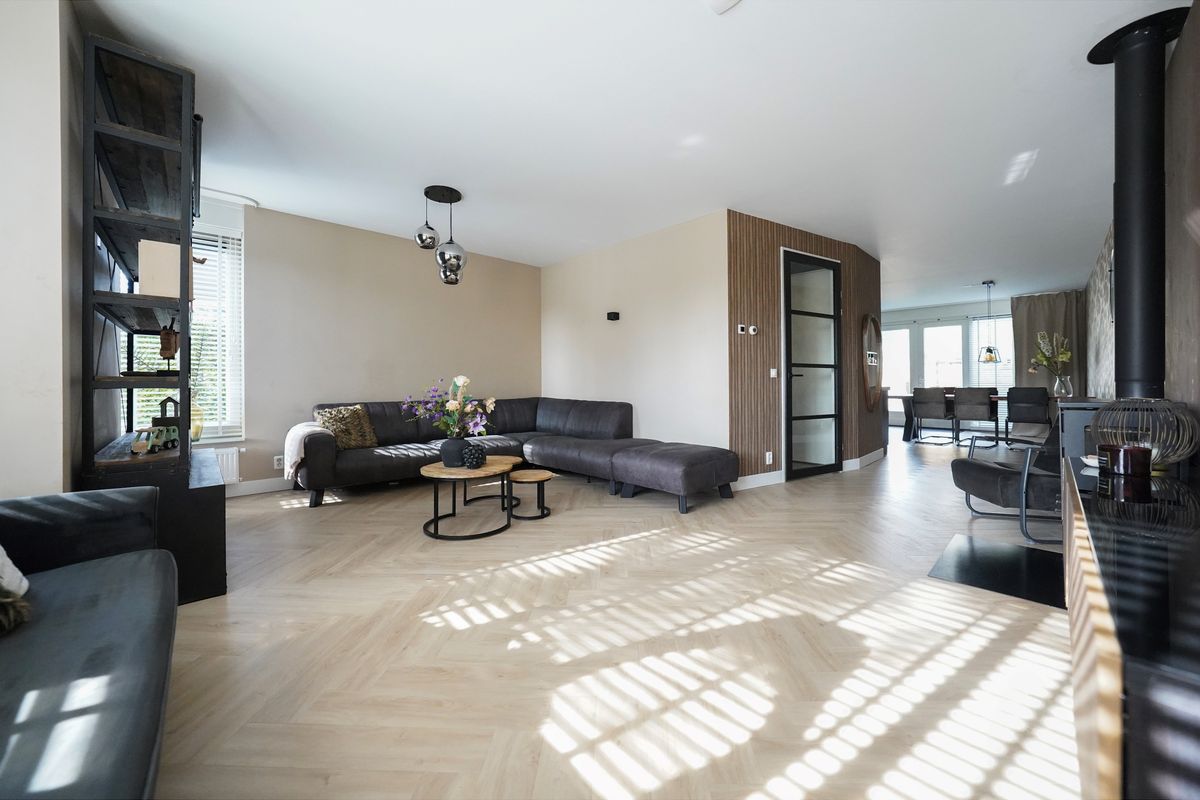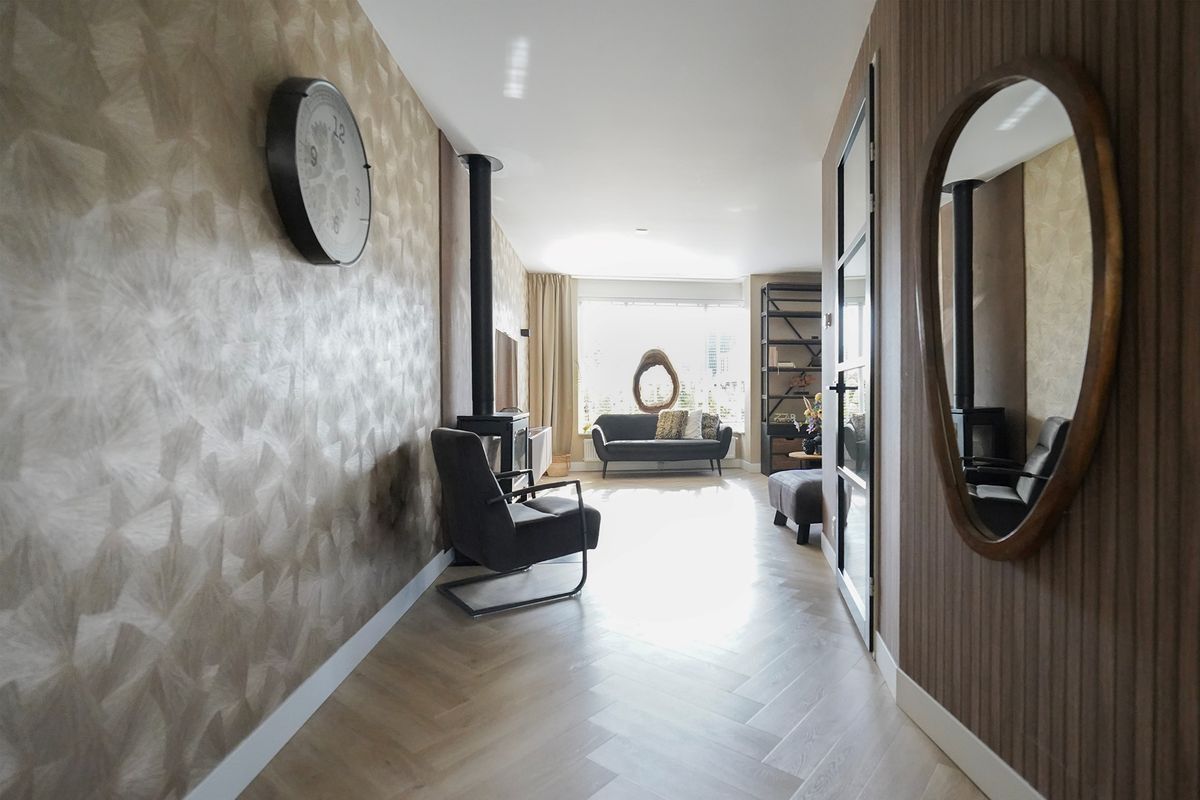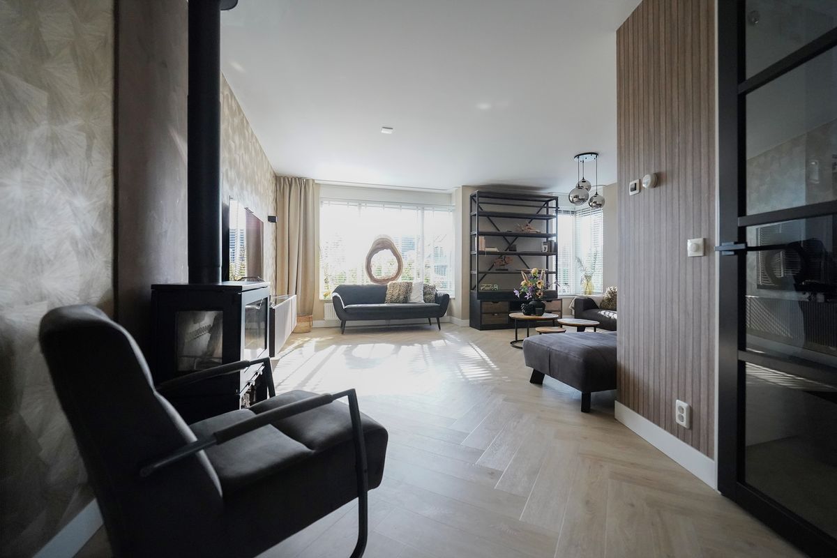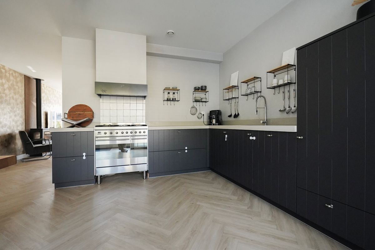 Door de zwarte deur met glaspartij komen we in de living. Van deze indeling word ik altijd erg enthousiast want de woonkeuken en de woonkamer zijn gescheiden van elkaar waarbij de woonkamer aan de voorzijde is gelegen. Een mooie ruimte met grote erker en hoekraam voor extra veel daglicht. De living is voorzien van een heerlijke houtkachel. De uitgebouwde woonkeuken is een geweldige ruimte, eigenlijk vergelijkbaar met de woonkamer. Hier kun je letterlijk en figuurlijk om de eettafel heen dansen als je zou willen. Ook is deze ruimte eventueel af te sluiten met mooie stalen of houten deuren. De achterpui is bijna geheel voorzien van glas en via openslaande deuren loop je zo de tuin in. De hoekkeuken is neutraal en sfeervol ingericht voorzien van alle inbouwapparatuur waaronder een mooie gaskookplaat met oven.