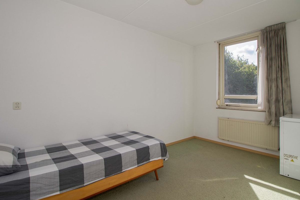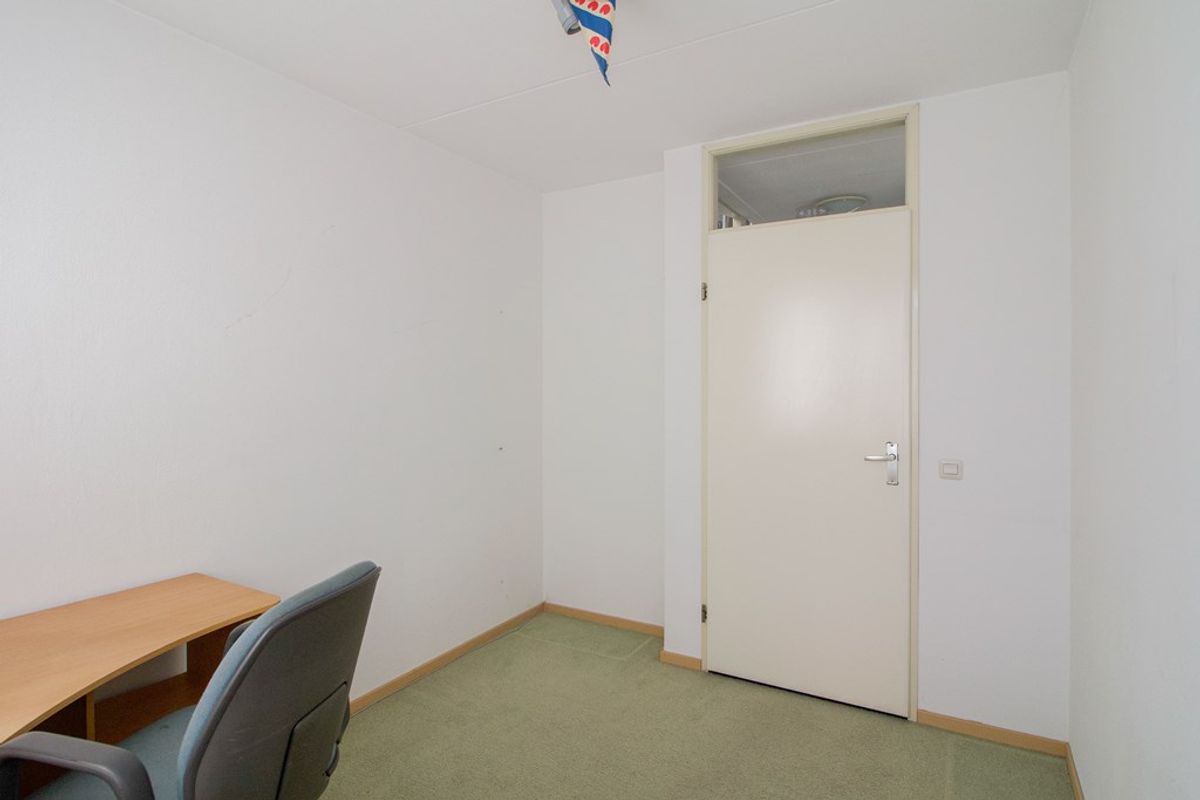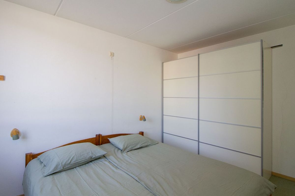 Overloop met toegang tot een ruime slaapkamer met vaste kastenwand (VK) en extra bergruimte. Daarnaast is er nog een aparte berging aanwezig.