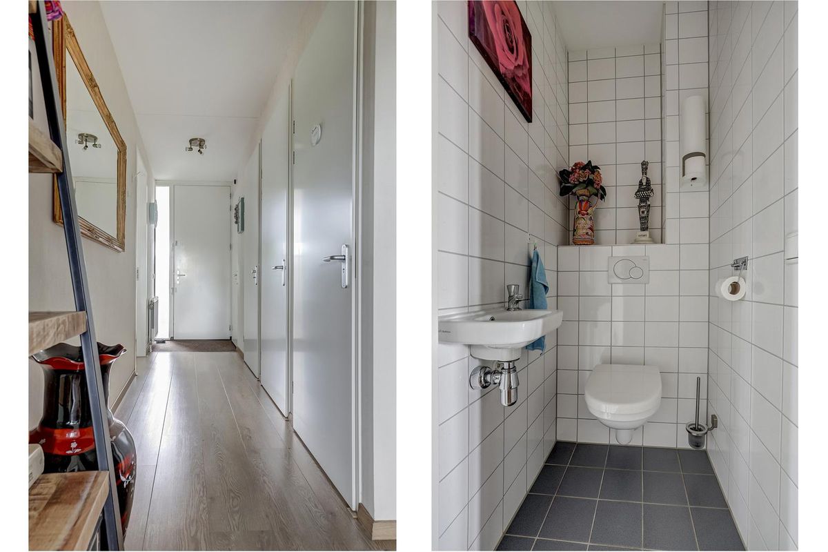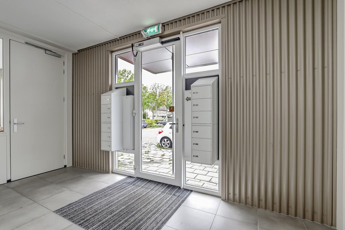 Bij binnenkomst in het gebouw valt direct de moderne uitstraling op. U betreedt het complex via een nette centrale entree met brievenbussen en video-intercom. Met de lift of trap bereikt u het appartement op de eerste verdieping.