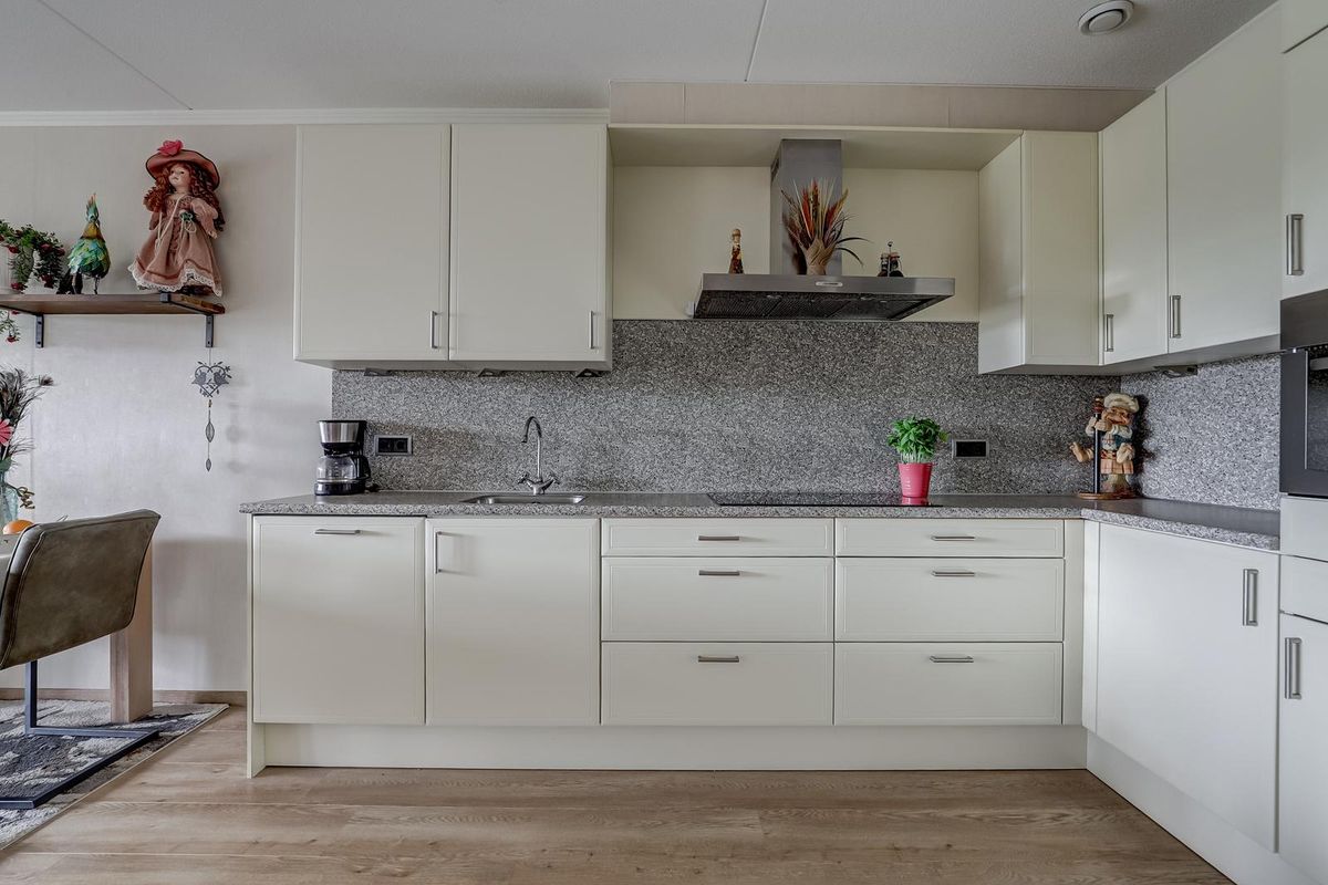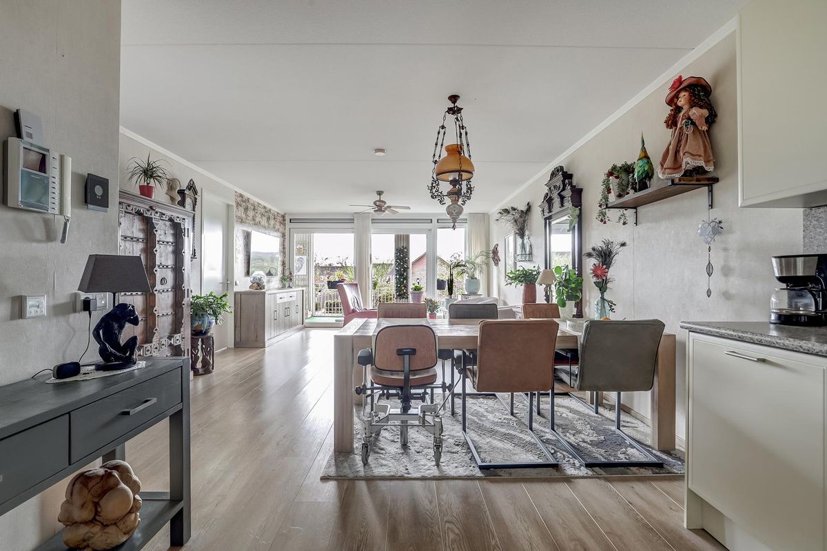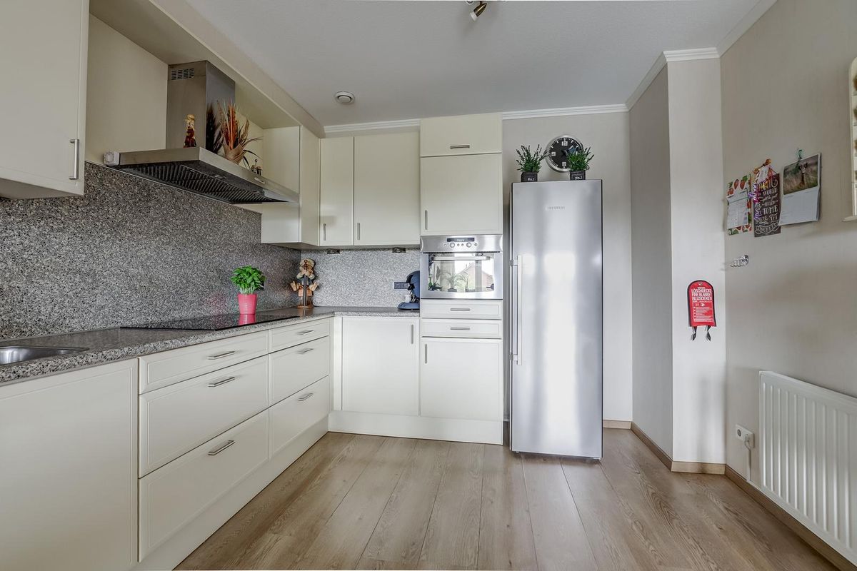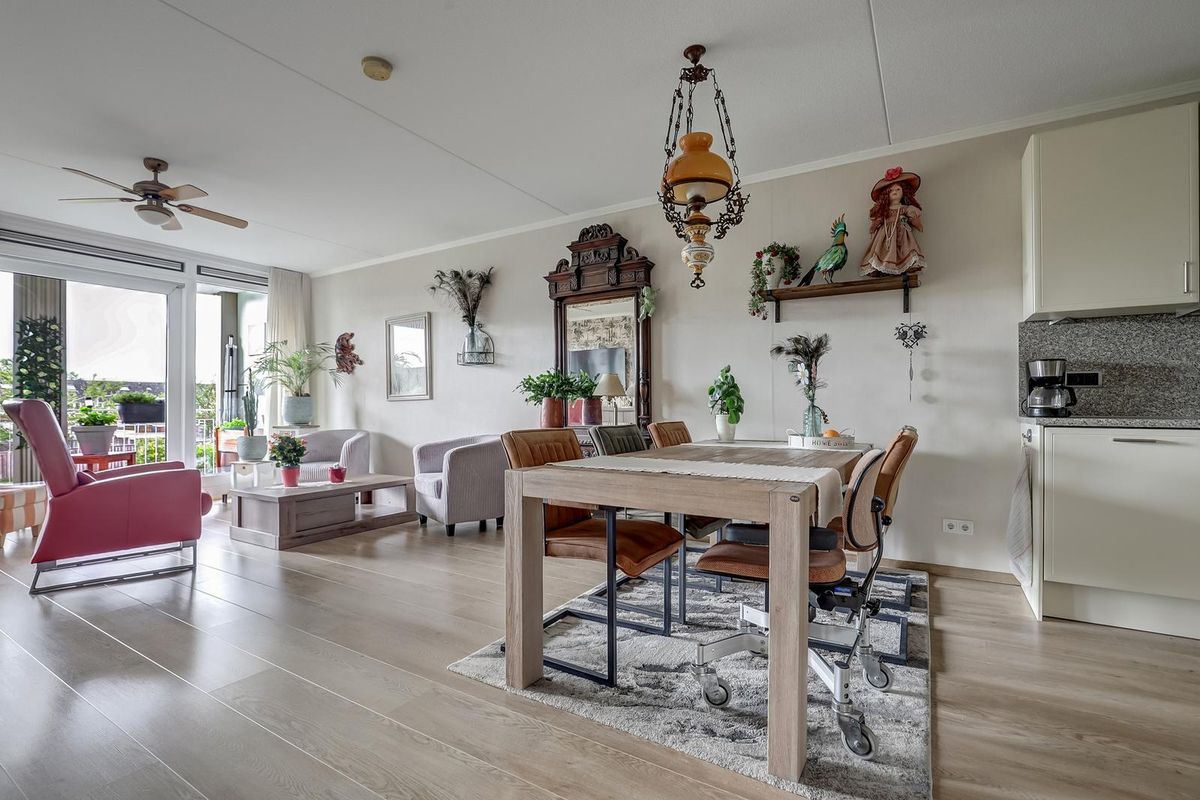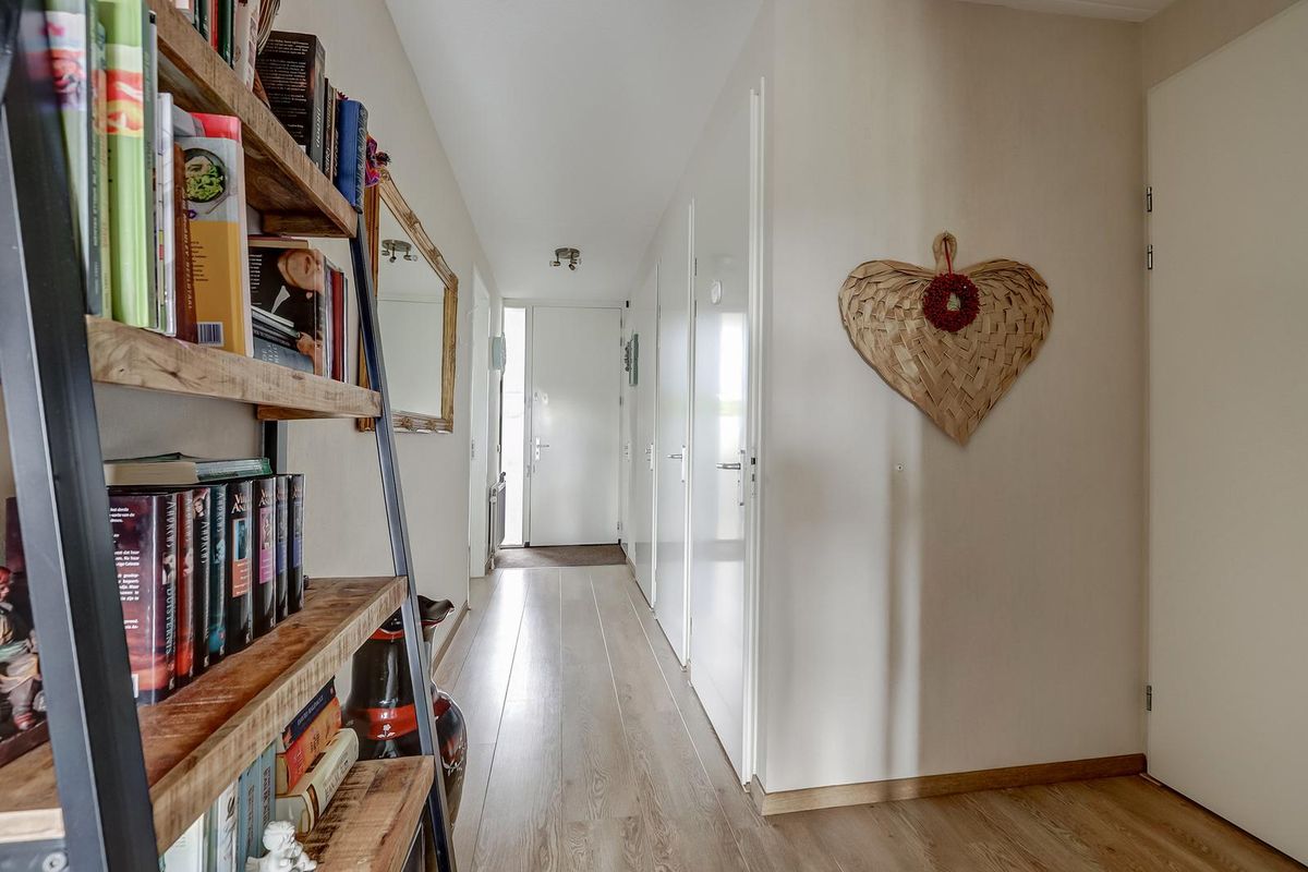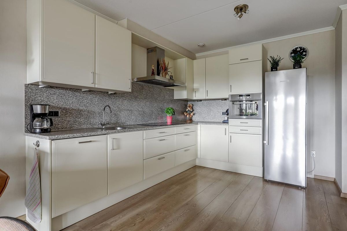 De hal van het appartement geeft toegang tot alle vertrekken. De lichte woonkamer is royaal opgezet en dankzij de grote raampartijen en de schuifpui naar het balkon is het hier heerlijk licht en ruimtelijk. De open keuken is modern uitgevoerd met strakke kastfronten en inbouwapparatuur. De woonkamer biedt volop ruimte voor een comfortabele zithoek én een royale eethoek.