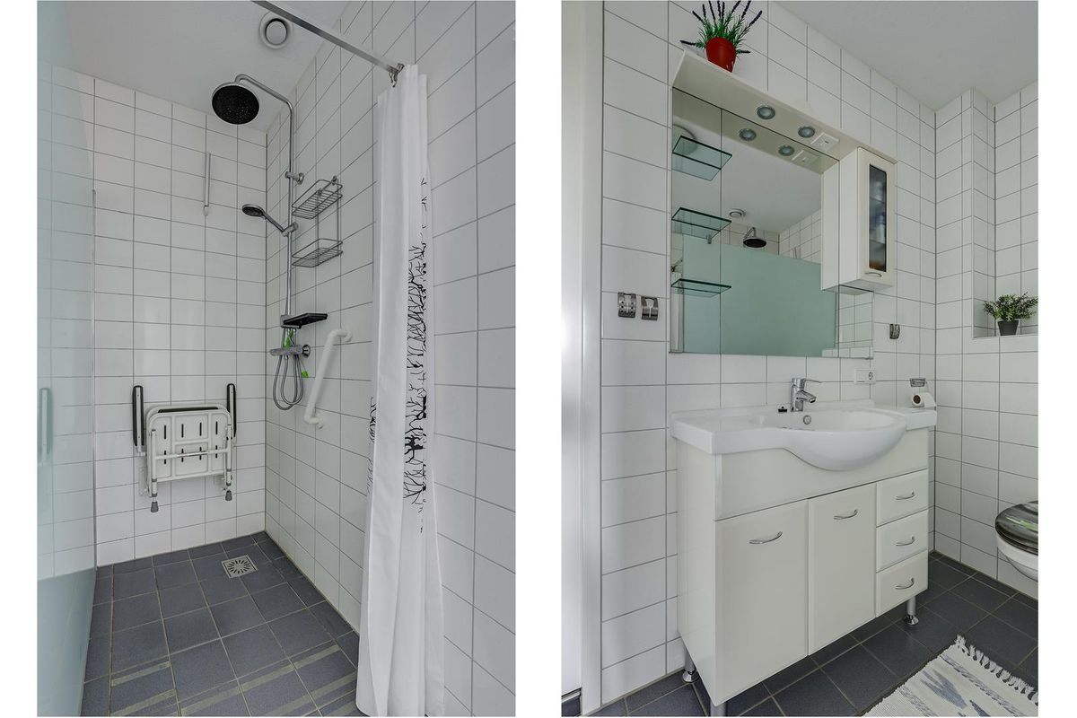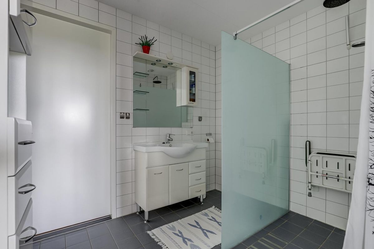 De badkamer is stijlvol en praktisch ingericht met een ruime inloopdouche, wastafelmeubel met opbergruimte en een moderne afwerking in neutrale tinten. Er is een separate toiletruimte in de hal en een grote berging met wasmachineaansluiting.