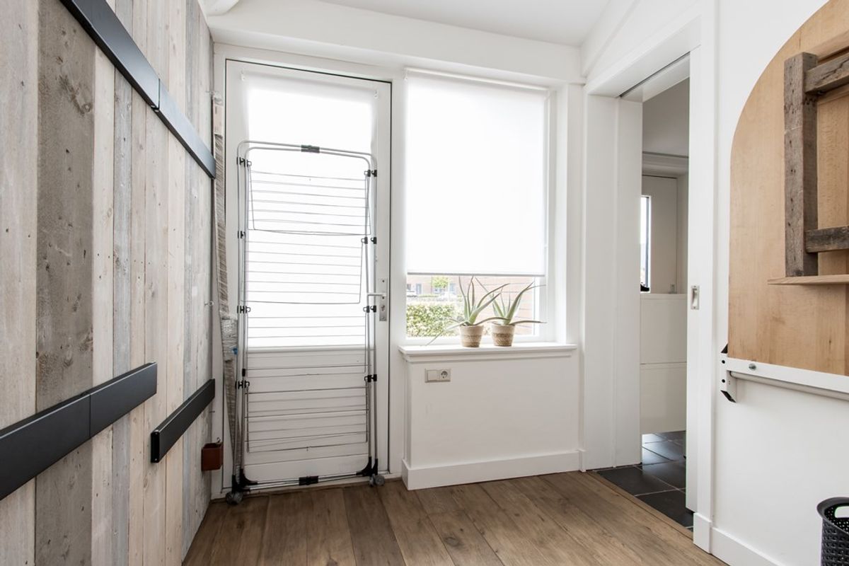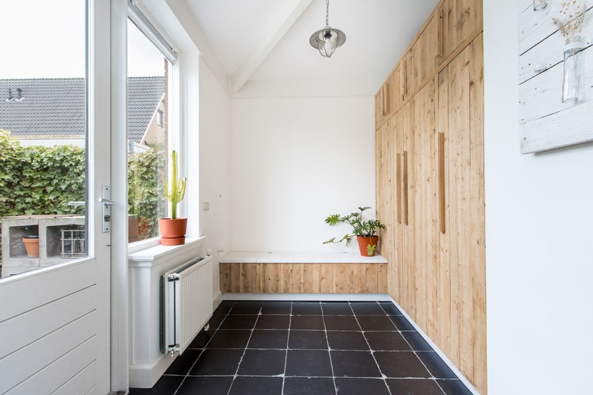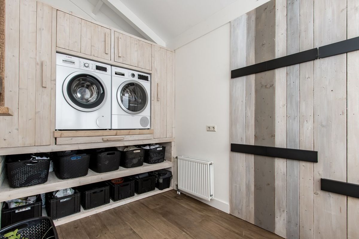 Via de openslaande deuren bereik je de achtertuin, waardoor binnen en buiten naadloos in elkaar overlopen. Aansluitend vind je de zeer praktische bijkeuken, ideaal voor extra opslag en dagelijks gebruiksgemak.