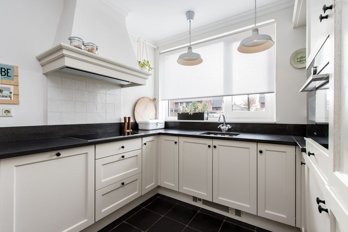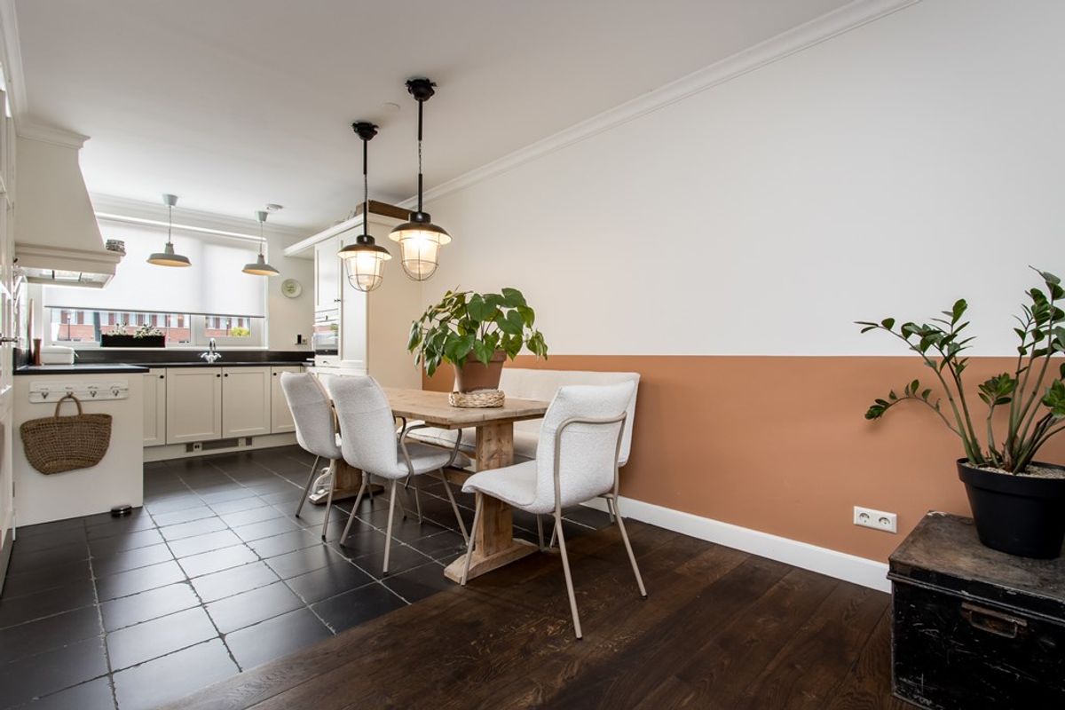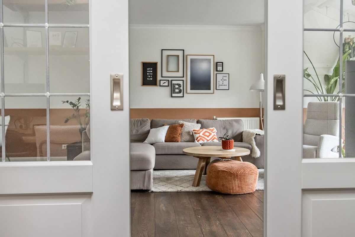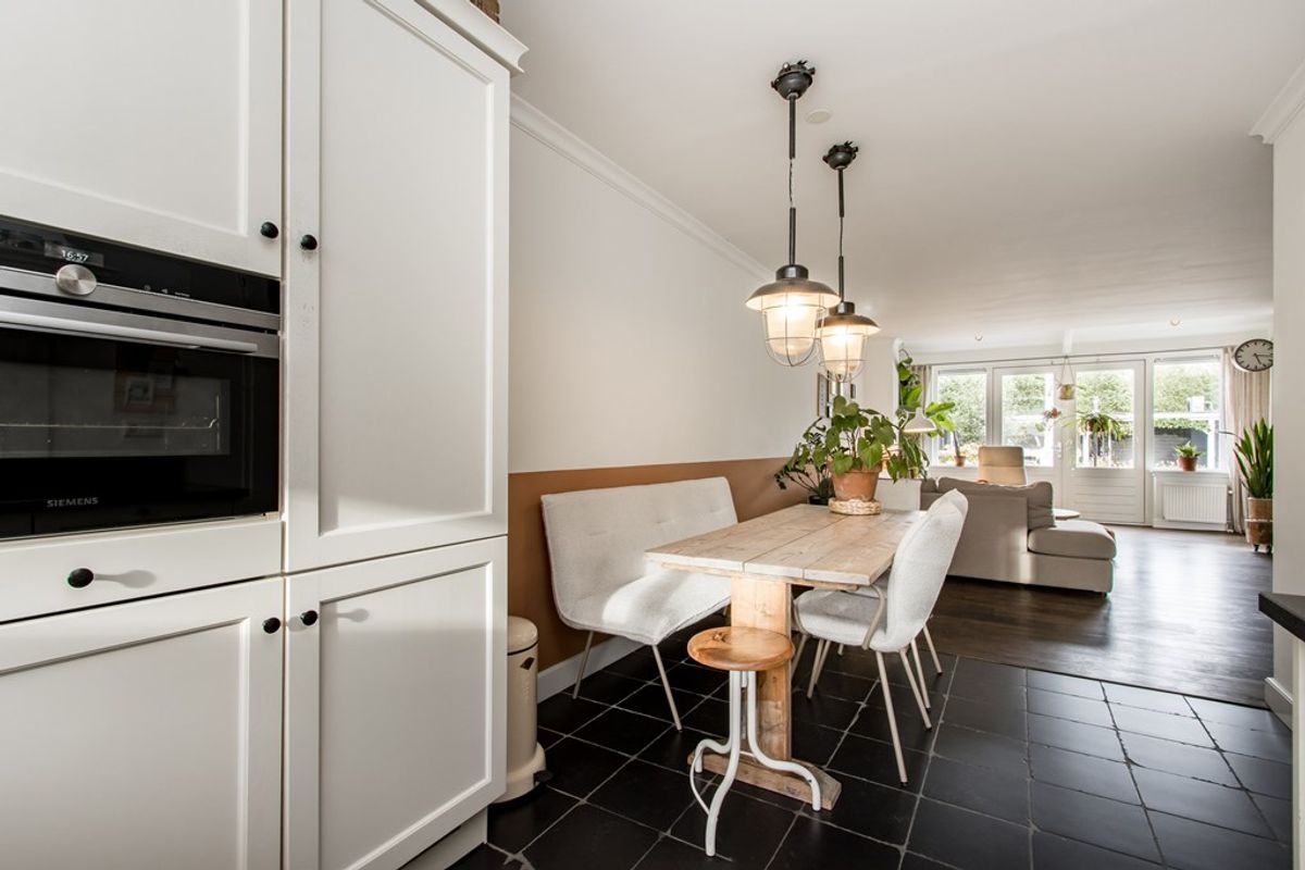 Via de openslaande deuren bereik je de achtertuin, waardoor binnen en buiten naadloos in elkaar overlopen. Aansluitend vind je de zeer praktische bijkeuken, ideaal voor extra opslag en dagelijks gebruiksgemak.