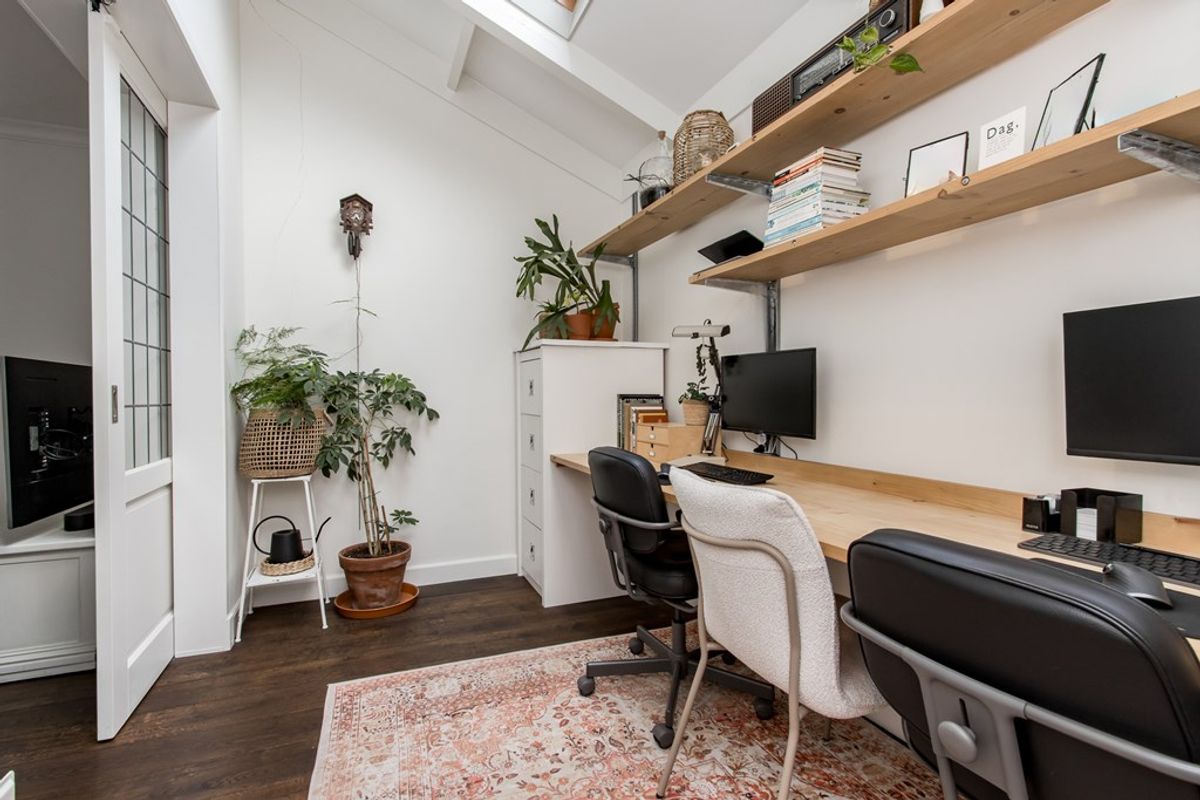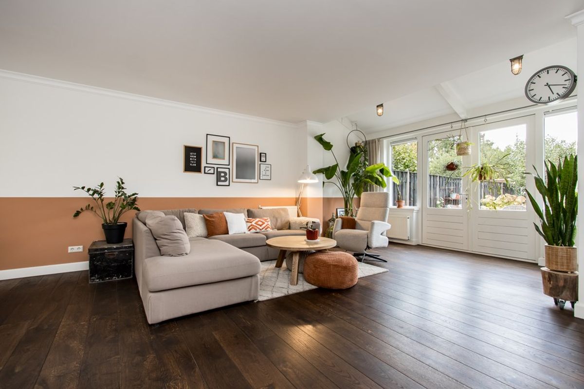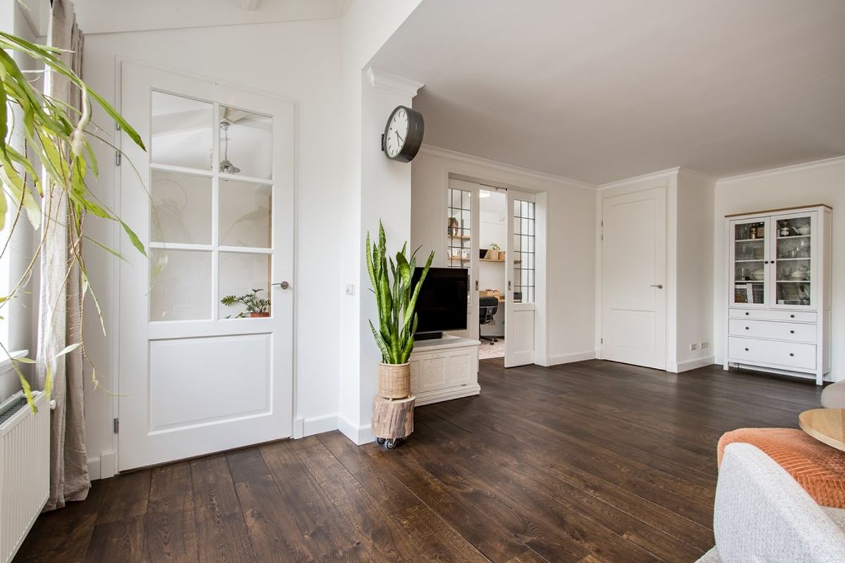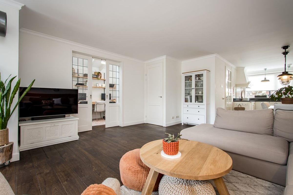 De uitgebouwde woonkamer is bijzonder ruim en licht dankzij de grote raampartijen aan de achterzijde. Hier is volop ruimte voor een comfortabele zithoek en een royale eethoek. Daarnaast beschikt de woonkamer over een praktische bergkast en fraaie en-suite deuren die toegang geven tot het kantoor — ideaal voor thuiswerken of als speel-/studeerkamer.