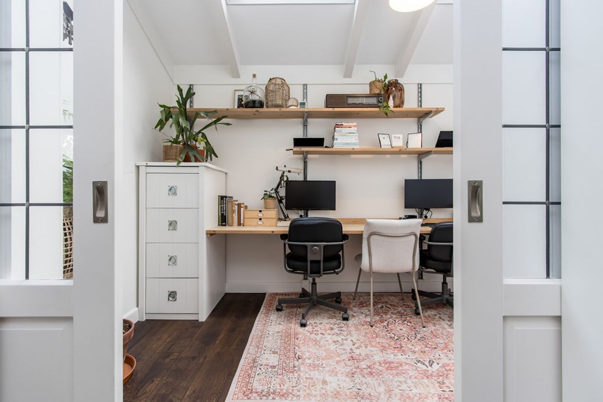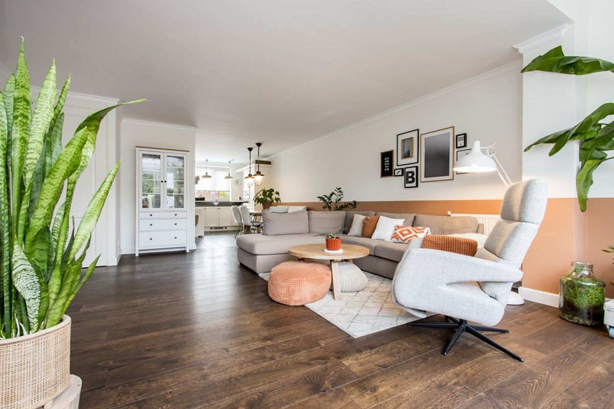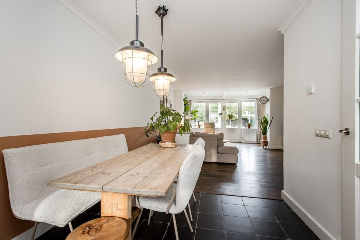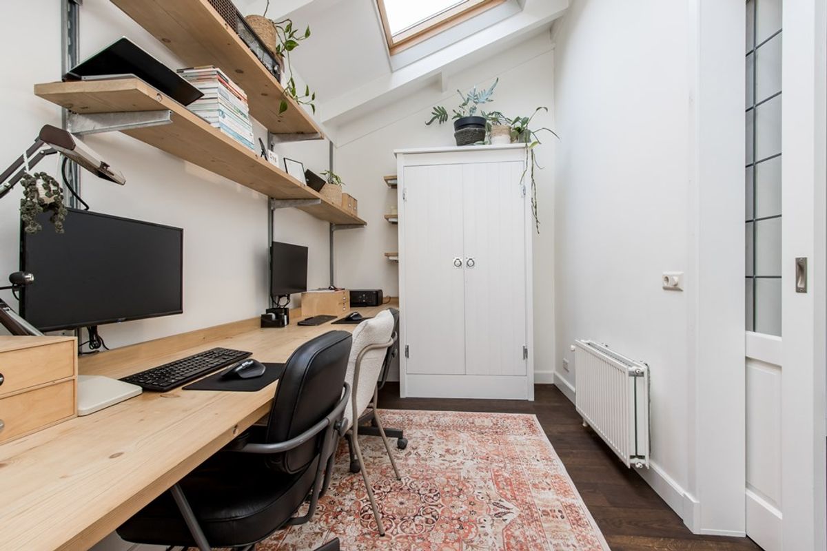 De uitgebouwde woonkamer is bijzonder ruim en licht dankzij de grote raampartijen aan de achterzijde. Hier is volop ruimte voor een comfortabele zithoek en een royale eethoek. Daarnaast beschikt de woonkamer over een praktische bergkast en fraaie en-suite deuren die toegang geven tot het kantoor — ideaal voor thuiswerken of als speel-/studeerkamer.