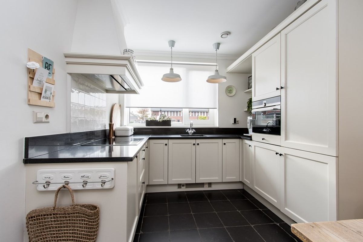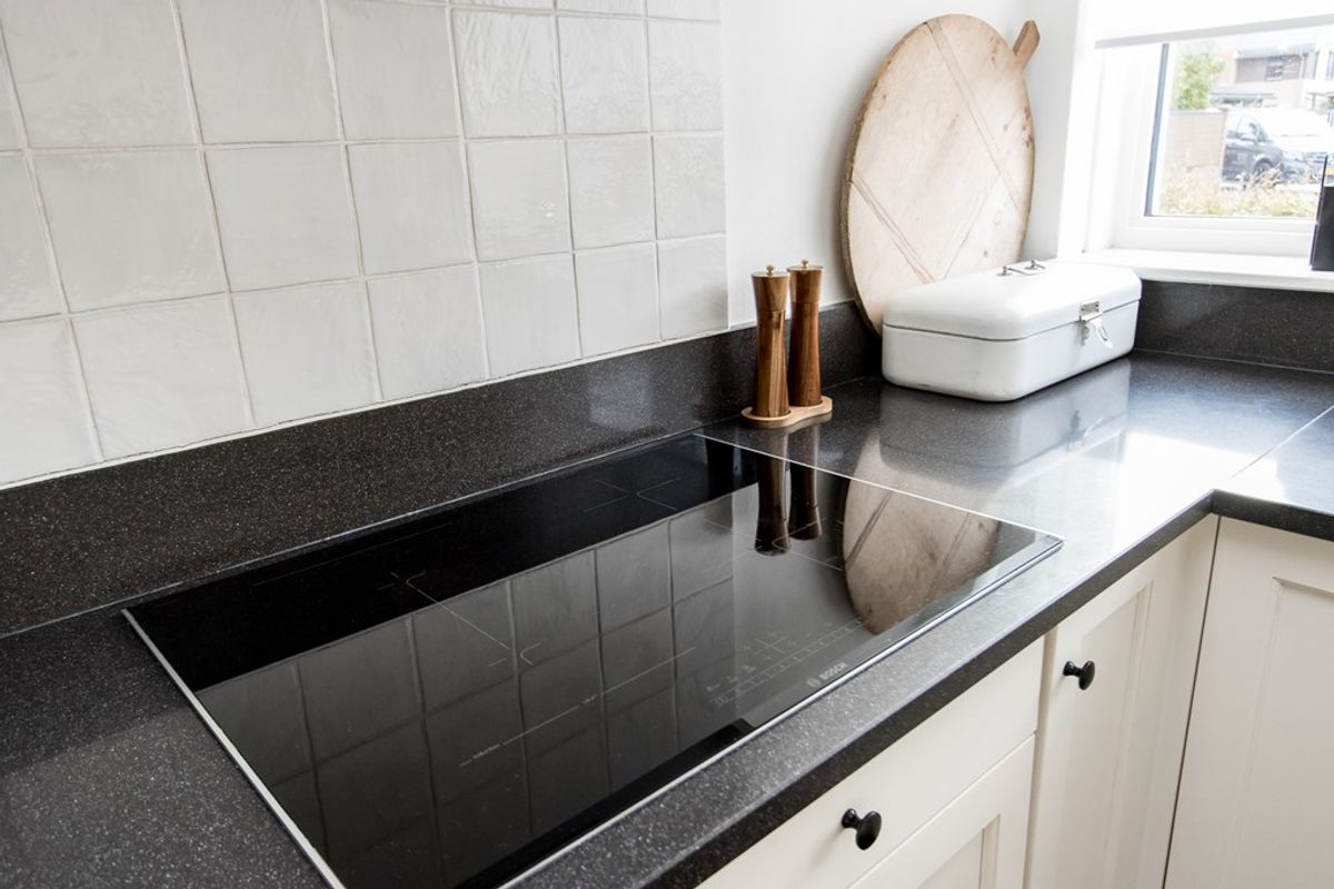 De riante woonkeuken is uitgevoerd in een praktische U-opstelling. De keuken is van alle gemakken voorzien, waaronder een inductiekookplaat met afzuigkap, vaatwasser, royale koelkast en een spoelbak. Hier kook en leef je in een fijne, open sfeer met voldoende werk- en opbergruimte.