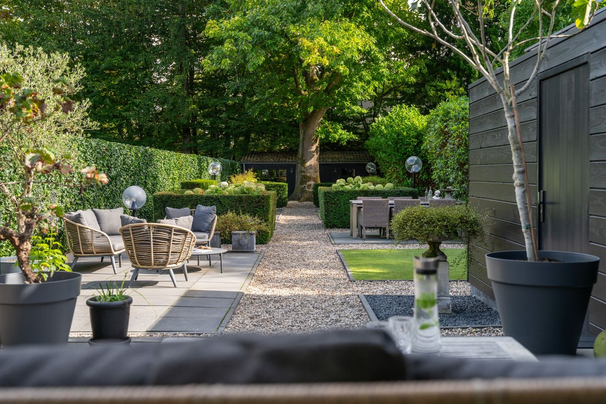 De achtertuin is verzorgd en royaal opgezet; een ideale plek voor gezinnen en liefhebbers van het buitenleven. Met een diepte van circa 45 meter biedt de tuin volop ruimte om te genieten van meerdere zithoeken, zowel in de zon als in de schaduw. De indeling is fraai en functioneel, met kunstgras en kleurrijke bloemenperken die zorgen voor een onderhoudsvriendelijke en sfeervolle uitstraling.