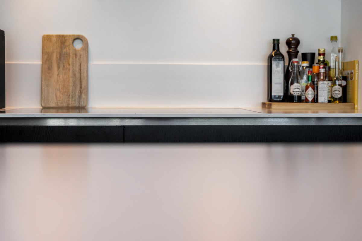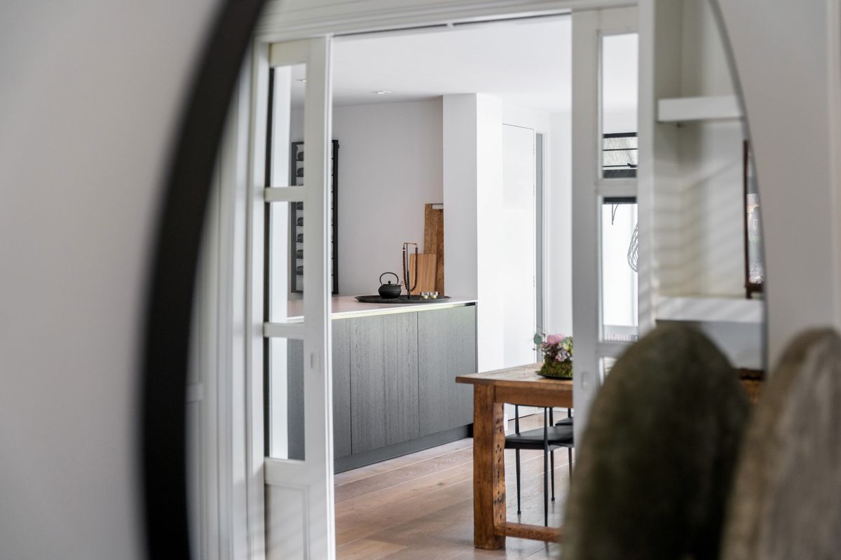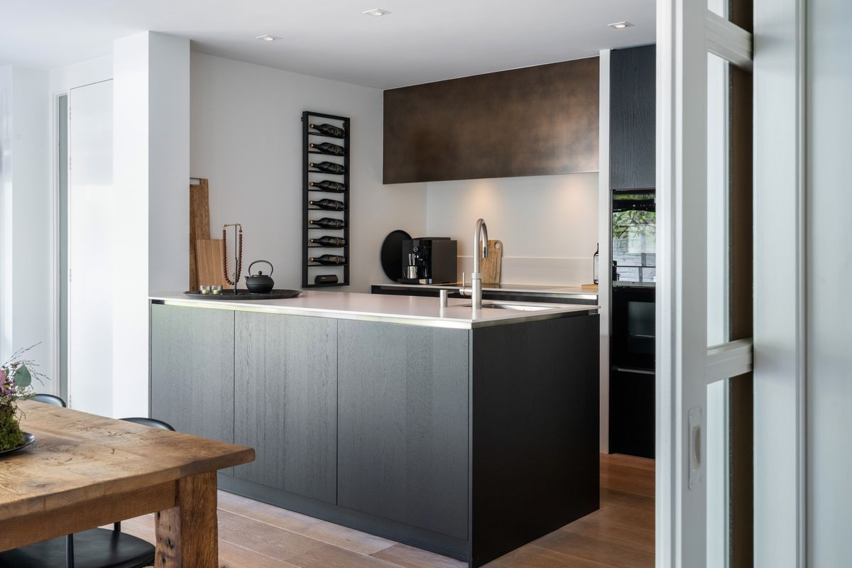 Aan de achterzijde bevindt zich de royale eethoek, voorzien van airconditioning, met directe toegang tot de moderne keuken. Deze is uitgerust met diverse hoogwaardige inbouwapparatuur, waaronder een Miele stoomoven en tweede oven, inductiekookplaat, Quooker en een ruime Liebherr-koelkast. Aansluitend treft u de bijkeuken met extra bergruimte, aansluitingen voor wasmachine en droger, en toegang tot de achtertuin.