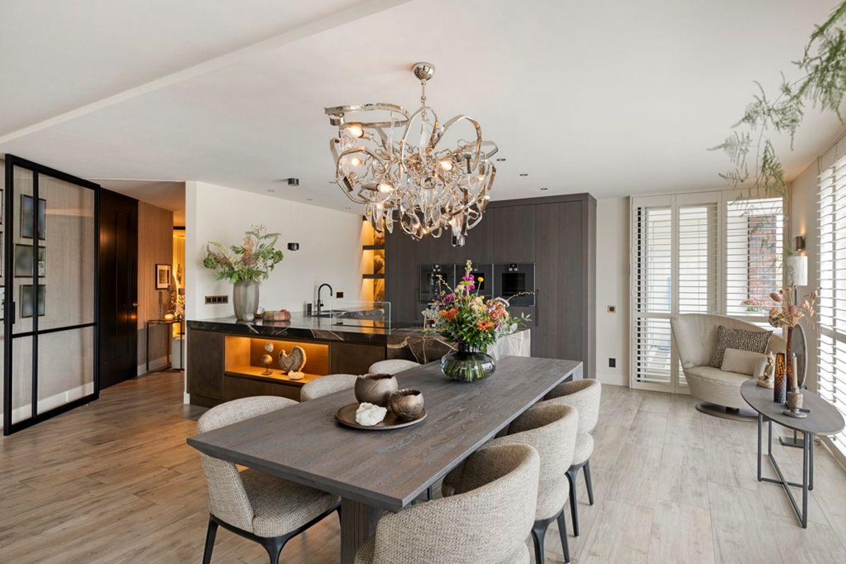 De luxe keuken vormt een waar pronkstuk. Het royale kookeiland nodigt uit tot lange diners en gezellige momenten, terwijl de hoogwaardige inbouwapparatuur van onder andere Gaggenau, waaronder een combi-oven, stoomoven, koffiemachine, inductiekookplaat met downdraft afzuiging, Quooker, vaatwasser, koelkast en vriezer, garant staat voor optimaal kookcomfort. Aansluitend bevindt zich de luxueuze eettafel, perfect gepositioneerd in het daglicht.