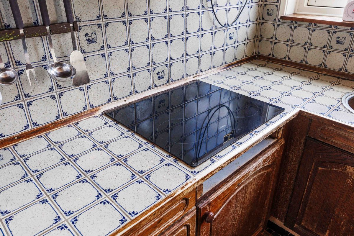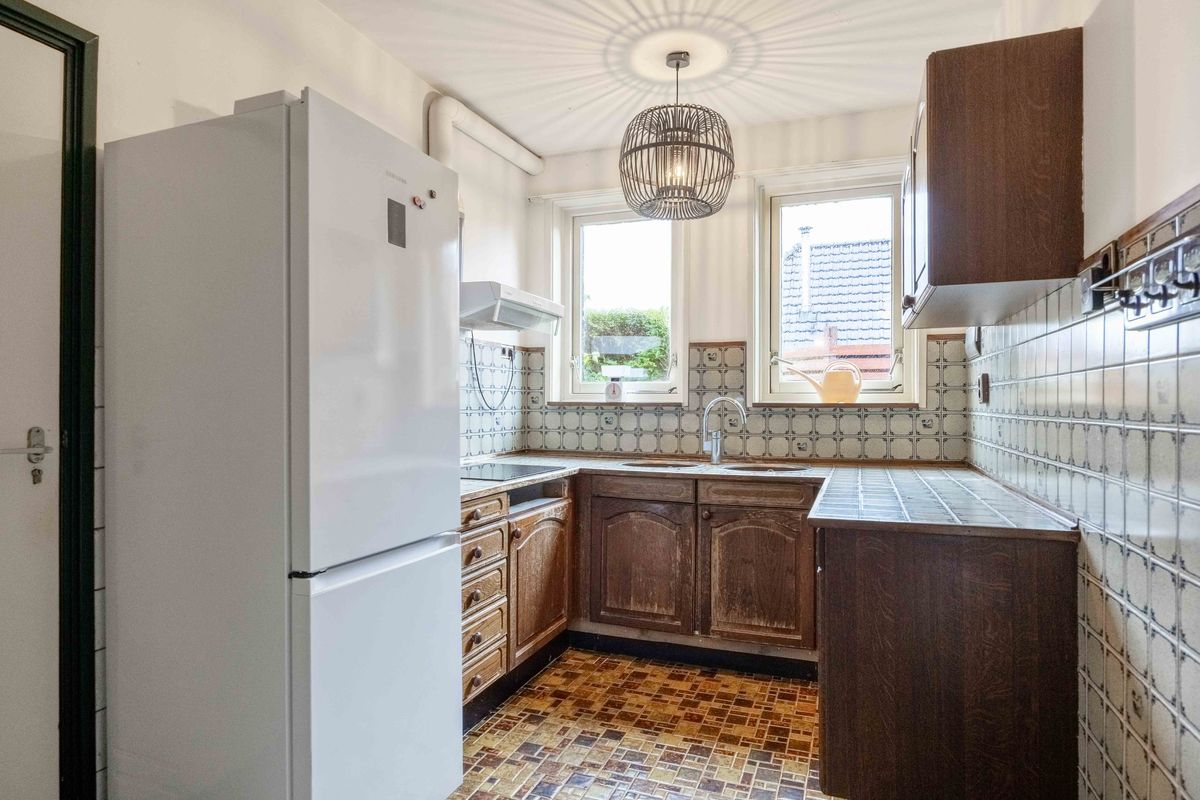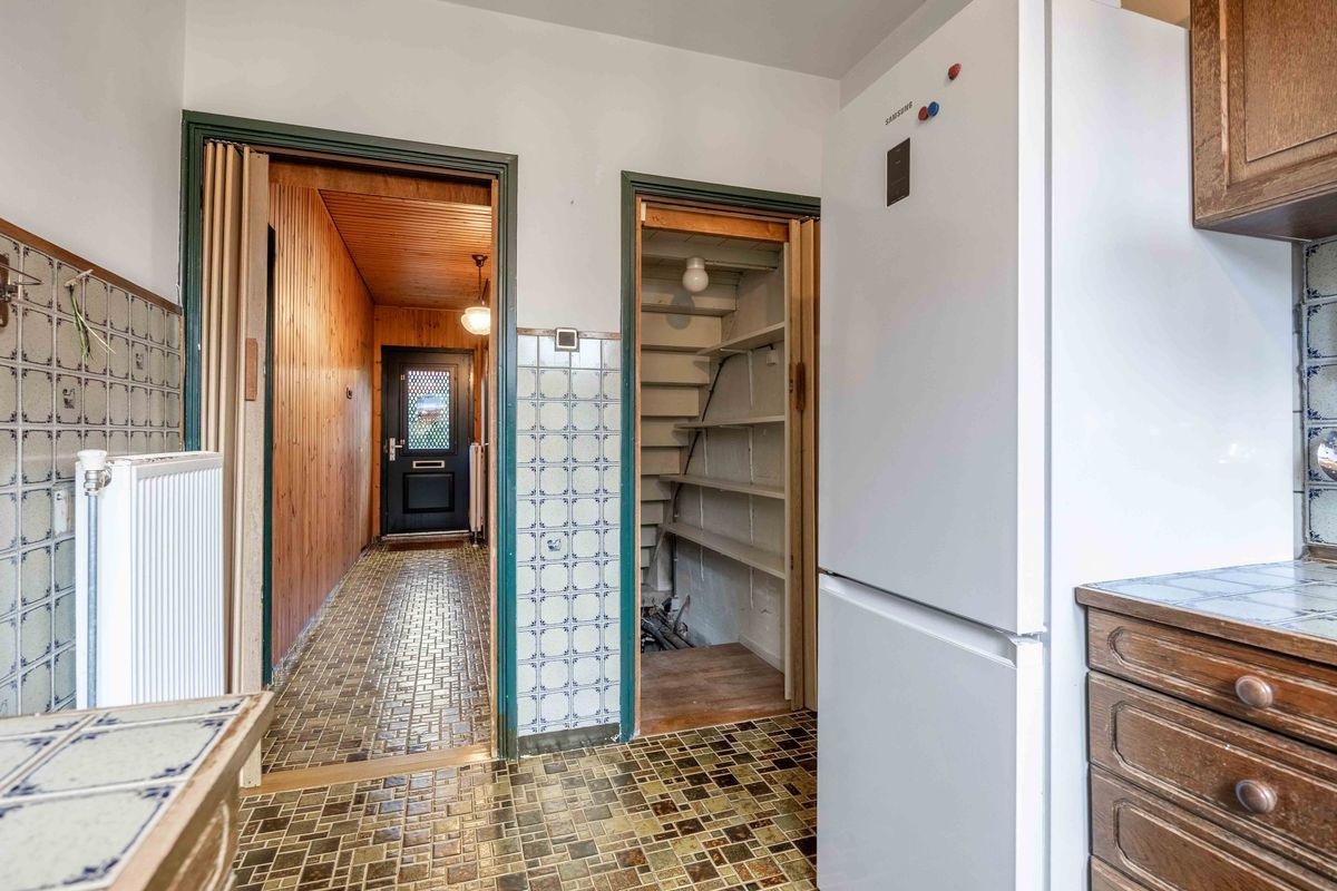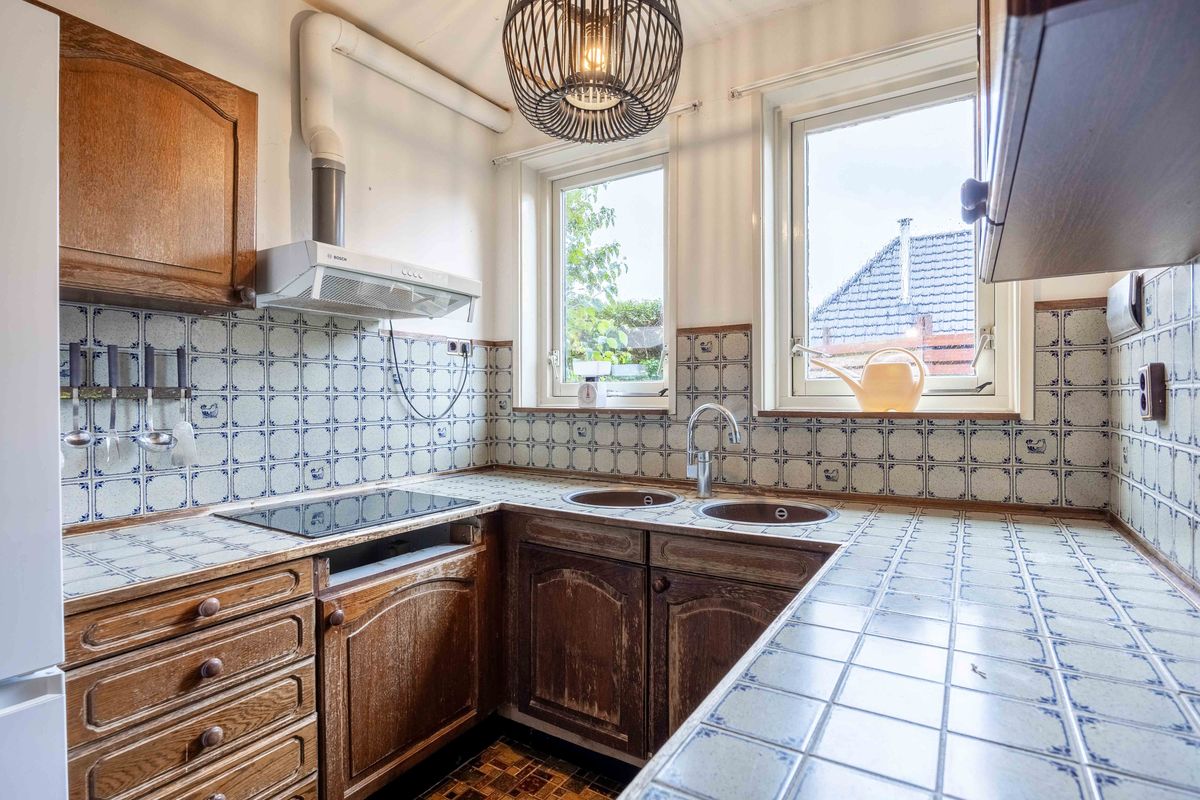 Grenzend aan de woonkamer bevindt zich de keuken, uitgevoerd in een praktische U-opstelling. Je beschikt hier over inbouwapparatuur: een koeler, vriezer, een keramische kookplaat en een afzuiging. Bovendien is er een handige trapkast/kelder perfect voor het bewaren van voorraad en schoonmaakspullen.